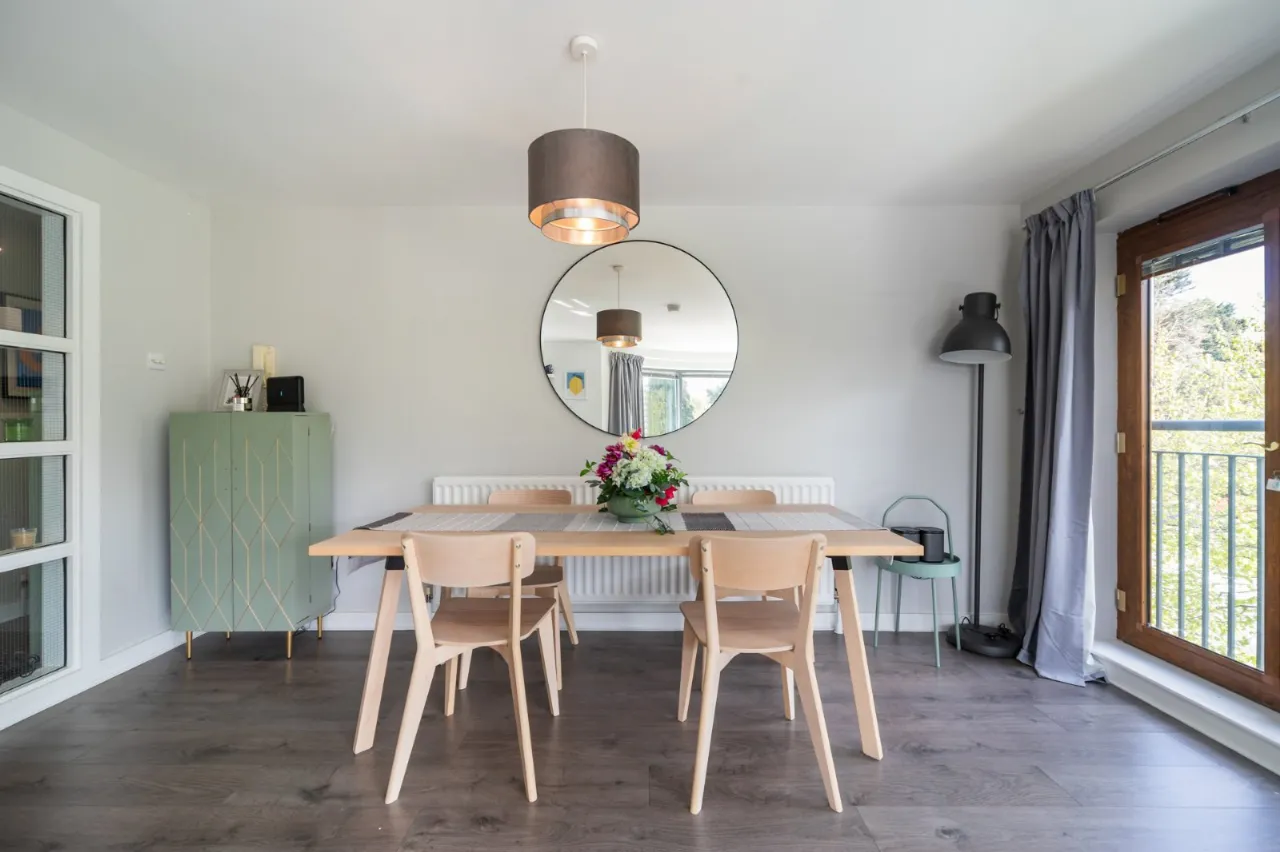 On the second floor the accommodation comprises a generous living room with a feature South-facing floor to ceiling bay window with a delightful verdant aspect, open plan dining area, a contemporary kitchen with integrated appliances, main bathroom and two double bedrooms, principal with an en suite shower room. Furthermore the property benefits from covered resident’s car parking with additional spaces for visitors.