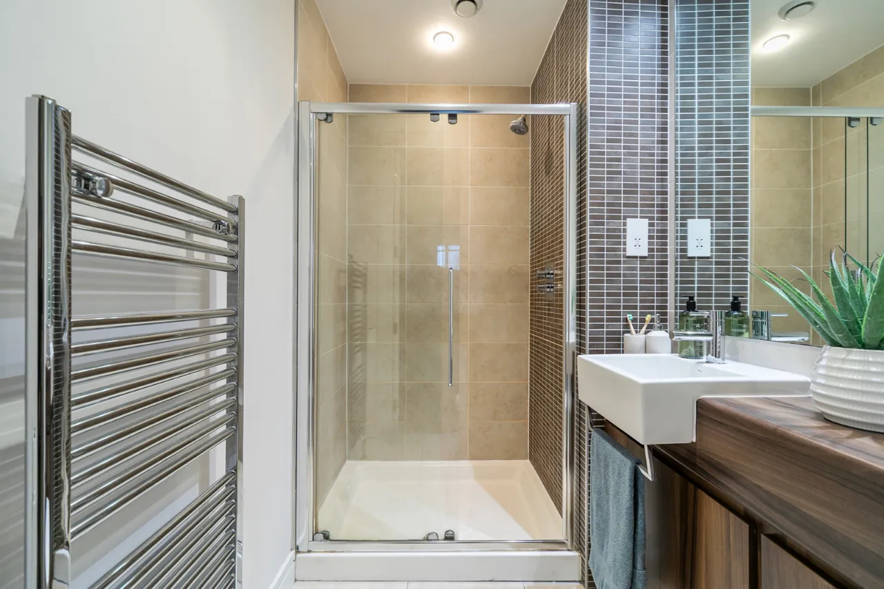 White suite comprising, low flush WC, floating wash hand basin with chrome mixer tap and built in vanity unit, push button panelled bath with fixed glass door, shower with chrome thermostatic control valve and telephone attachment, part tiled walls, tiled floor, chrome heated towel rail