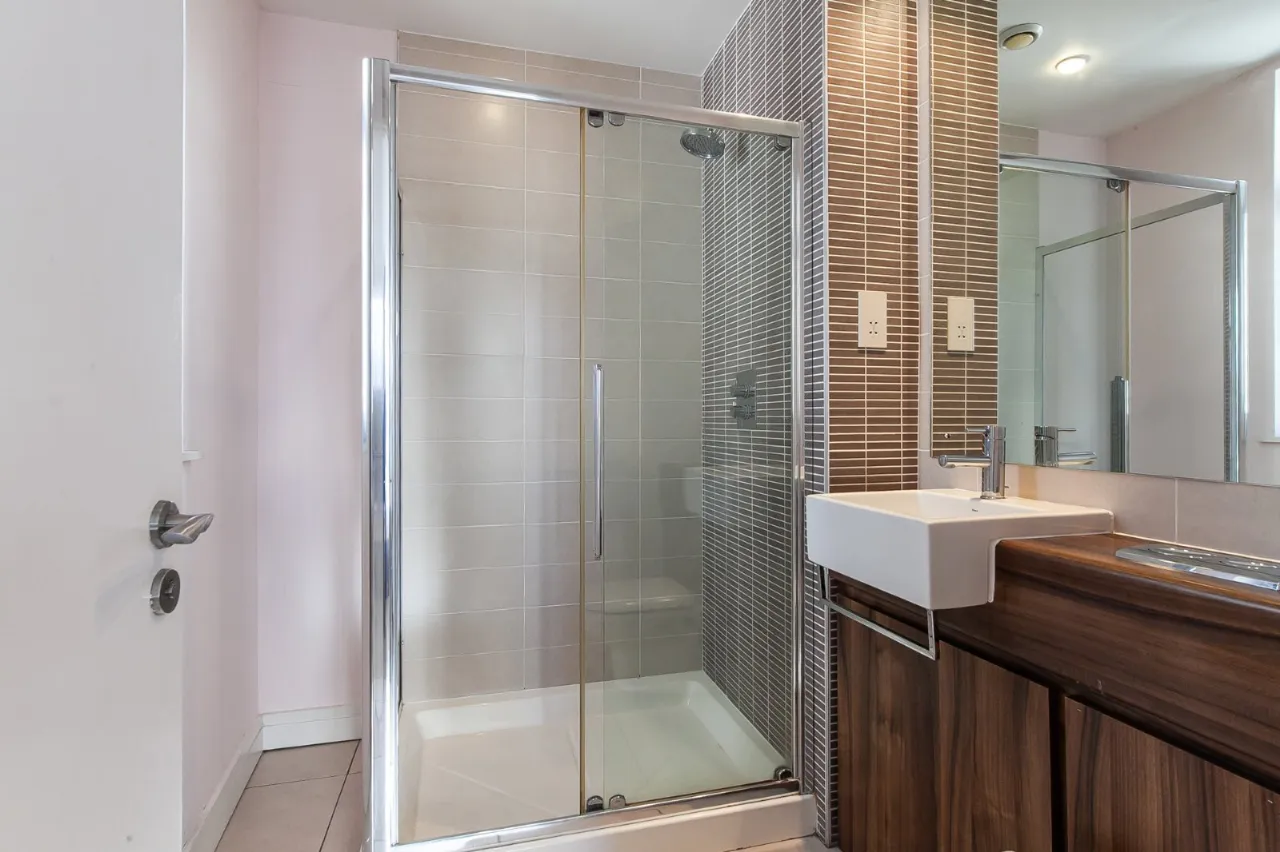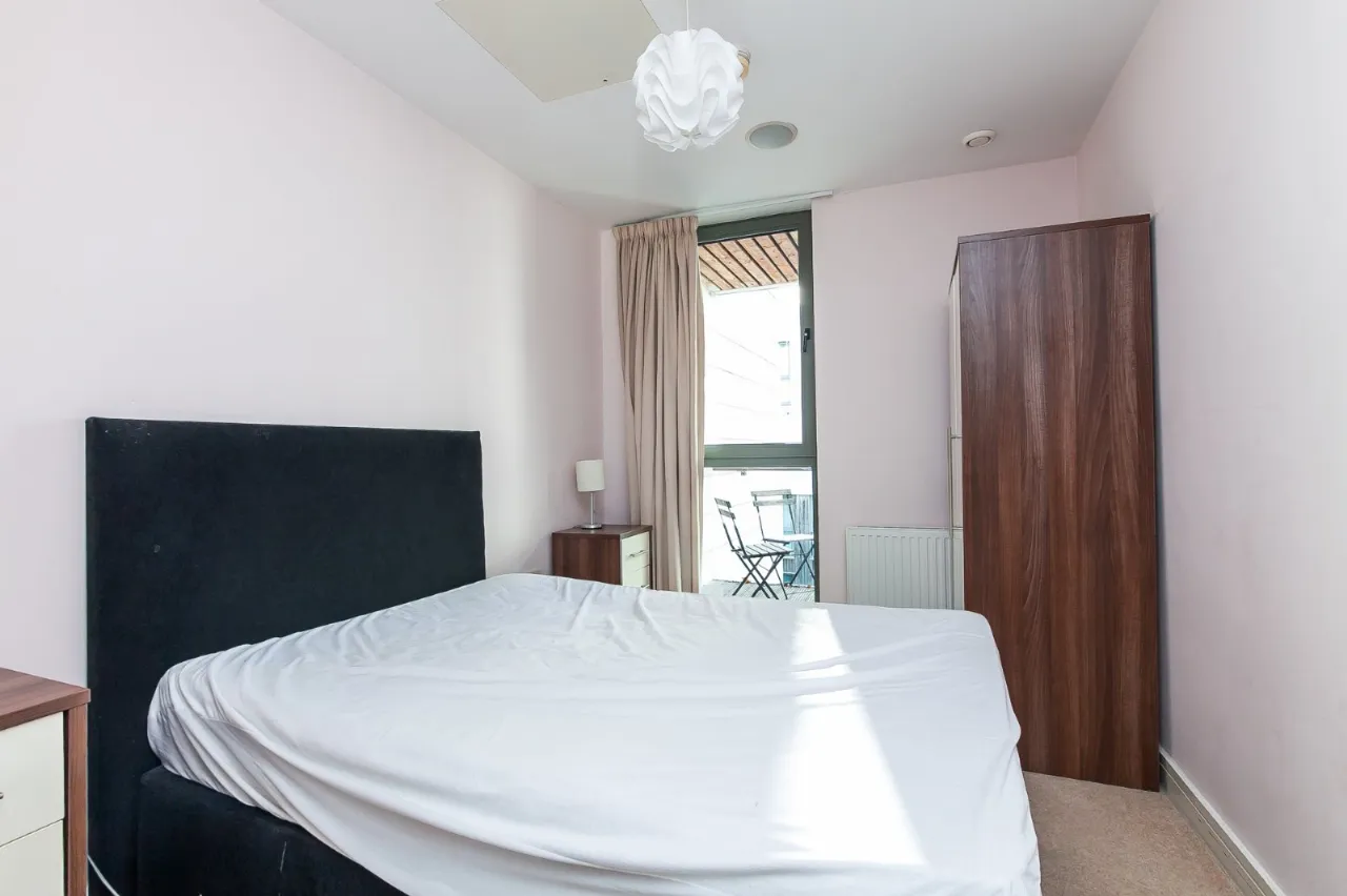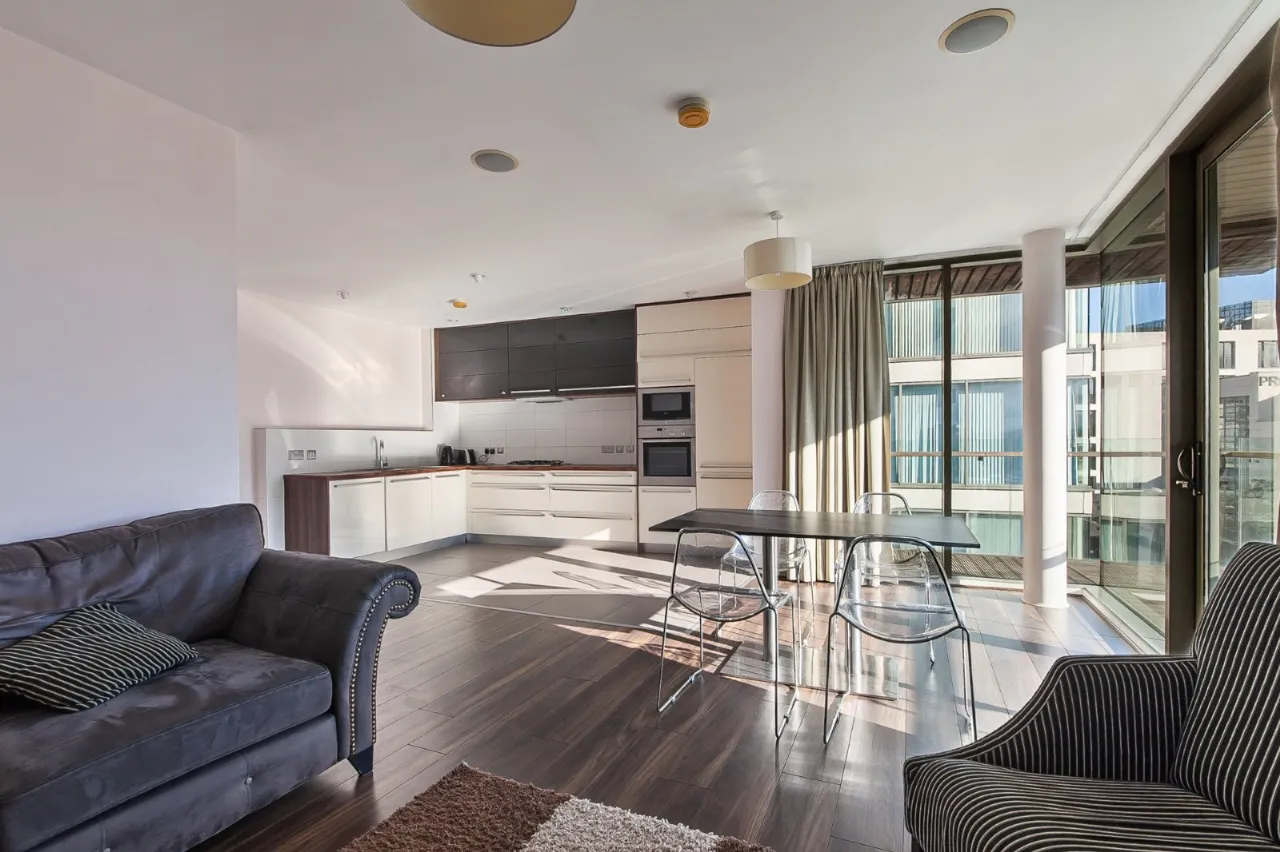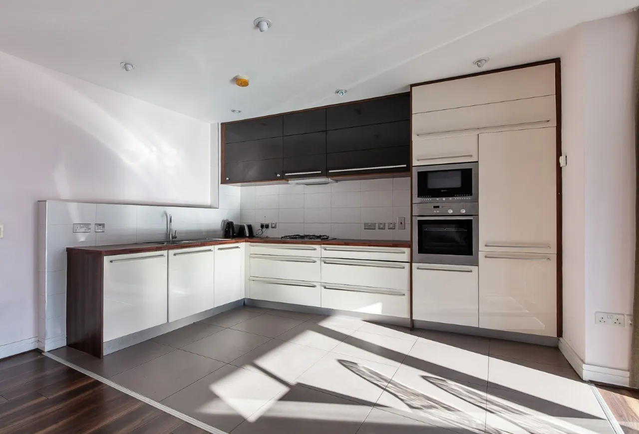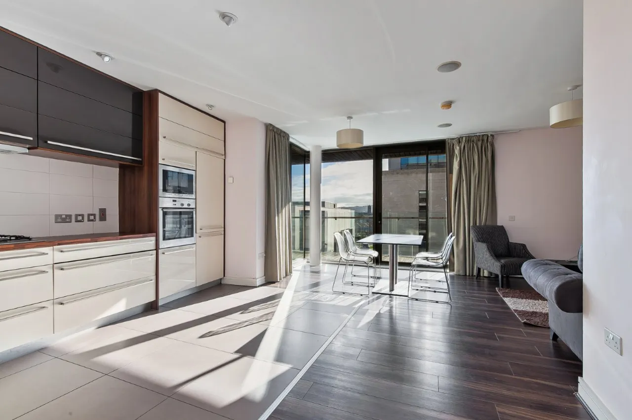 Open plan kitchen / living with laminate flooring meeting the tile floored kitchen. The room has neutral décor and provides outdoor space in the form of a wrap round balcony looking over the famous Titanic shipyard. The kitchen itself is fully fitted with units high and low, built in fridge freezer, dishwasher, oven and 4 ring gas hob.