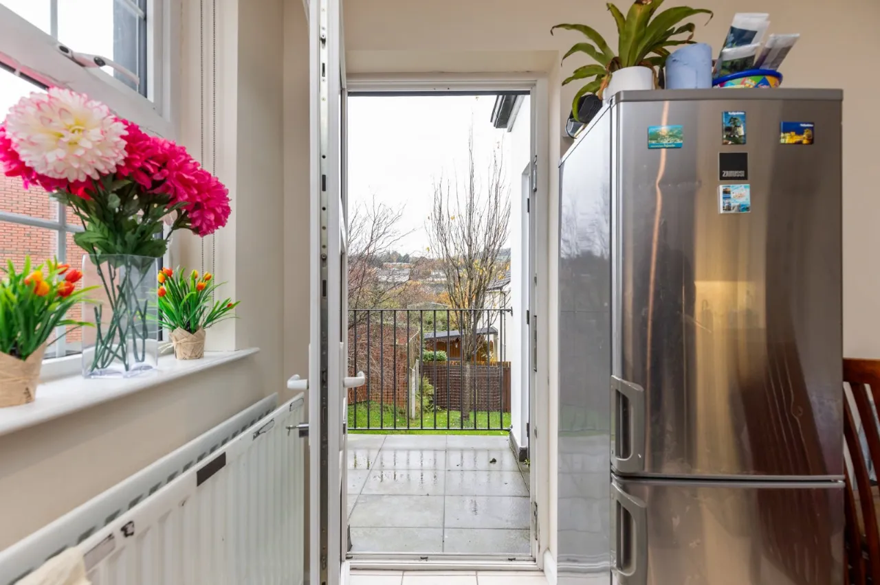 The property comprises a large living area featuring a beautiful bay window, creating a light-filled space perfect for relaxation and entertaining. An adjoining kitchen includes a range of integrated appliances and ample storage, while the formal dining area offers direct access to a private balcony ideal for morning coffee or evening dining.