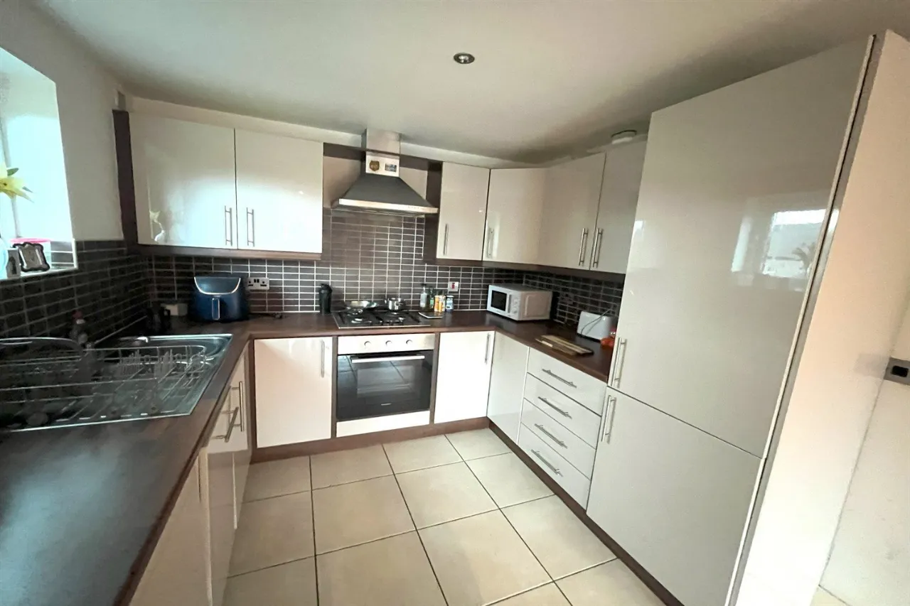 Ceramic tiled floor, partially tiled walls, 1 1/2 bowl stainless steel sink unit with mixer tap, range of high and low level white high gloss units, integrated electric oven, 4 ring gas hob, stainless steel extractor over, fridge freezer, dishwasher, plumber for washing machine.