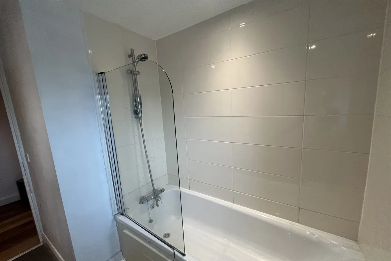 Ceramic tiled floor, partially tiled walls, extractor vents, chrome ladder heated towel rail, white suite comprising pedestal wash hand basin, panelled bath with thermostatically controlled shower and shower screen.
