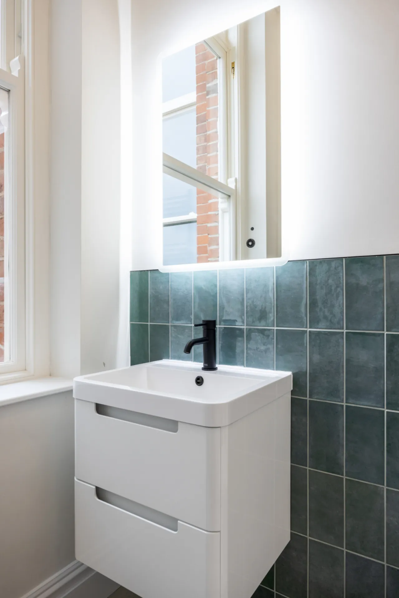 White Vanity Unit, Black Trim Shower and Tap, Matt Black Heated Towel Rail, Chriwic Green Wall Tile