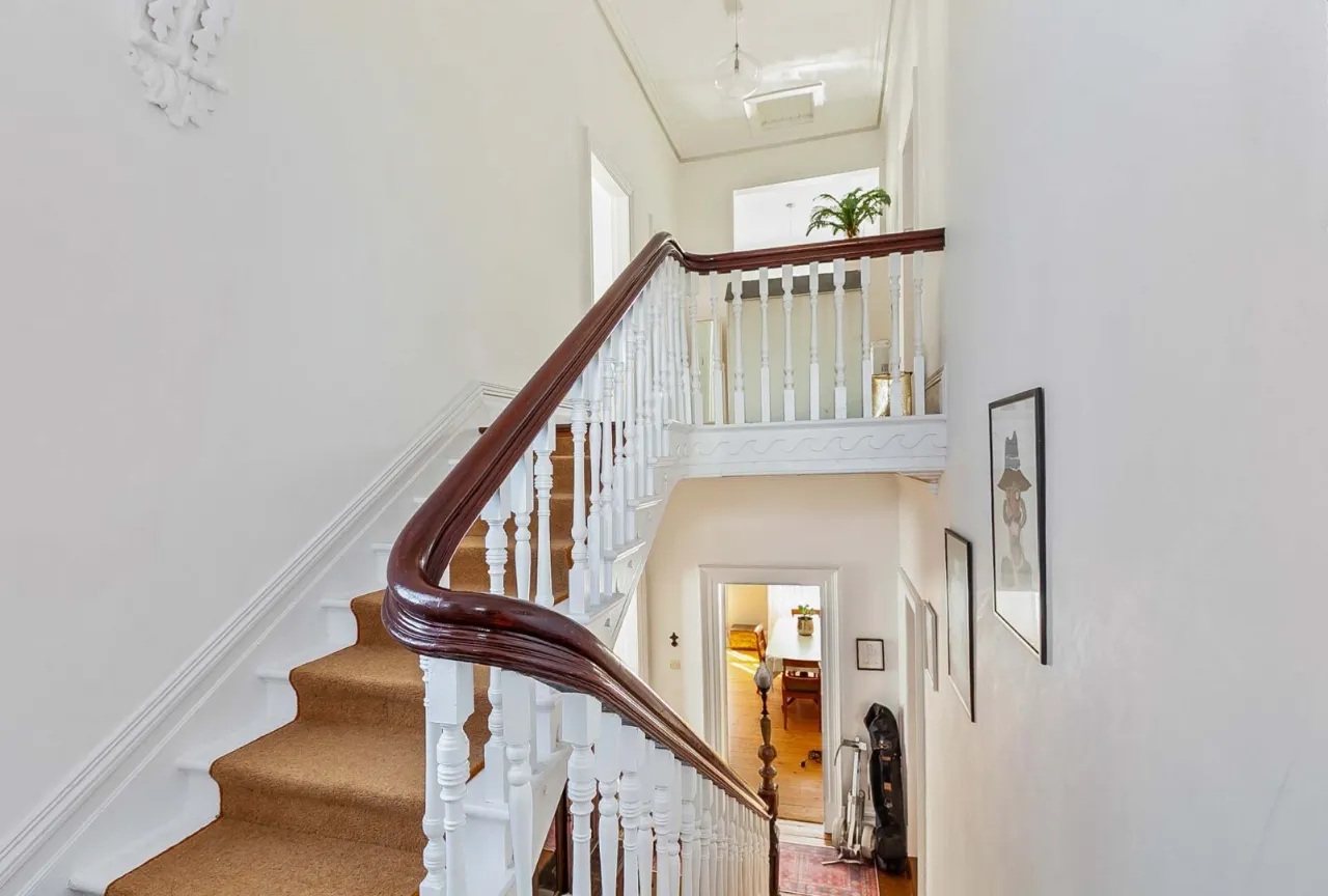 Wooden floor, under stair storage and corniced ceiling.