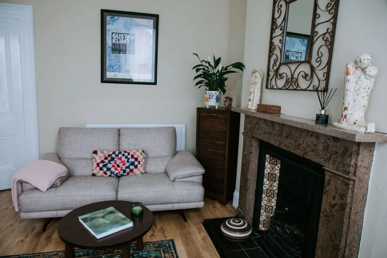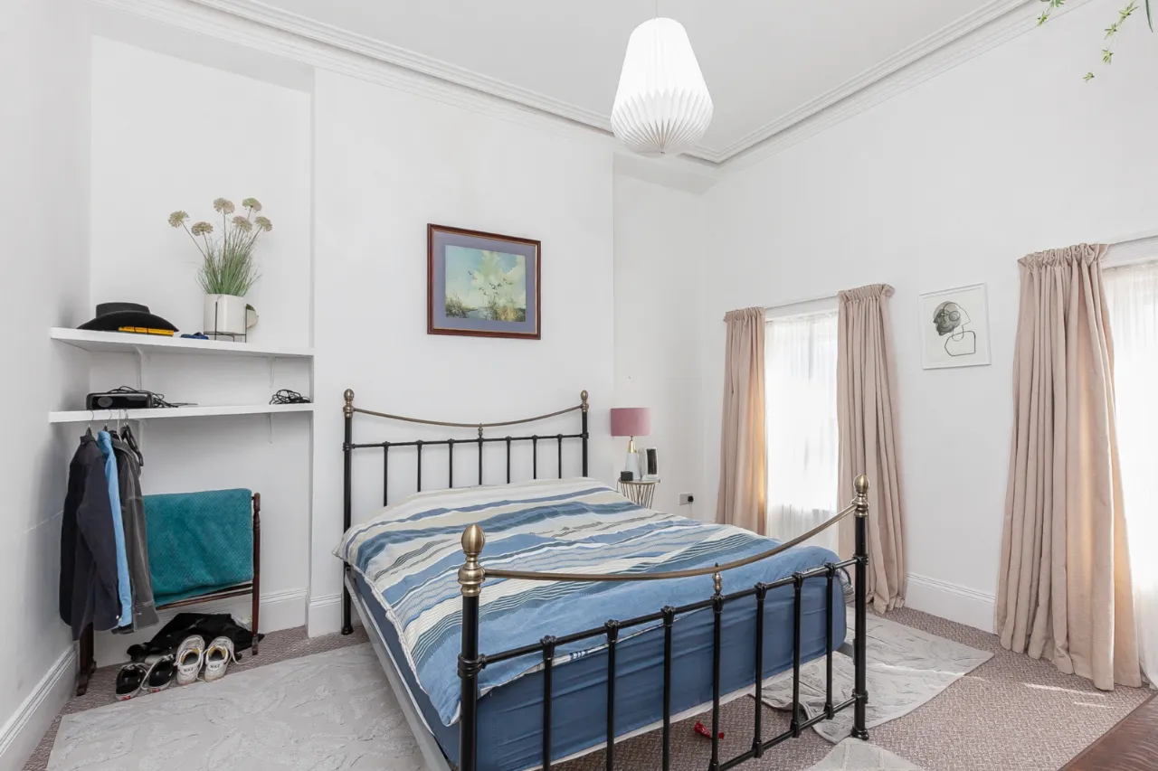 Solid wood floor, ceiling rose, corniced ceiling, feature fireplace (open), bespoke book shelves, an array of natural light and views over Black Mountain.