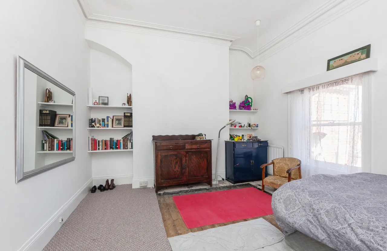 Ceiling corbel, corniced ceiling, wooden floor and access to loft.