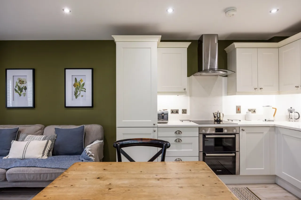 Florence porcelain white high and low-level units, Quartz Michelangelo stone worktops, up-stands and splash-back, Bosch double oven cooker with ceramic hob, inset sink, extractor hood, Integrated: dishwasher, washing machine and fridge freezer.