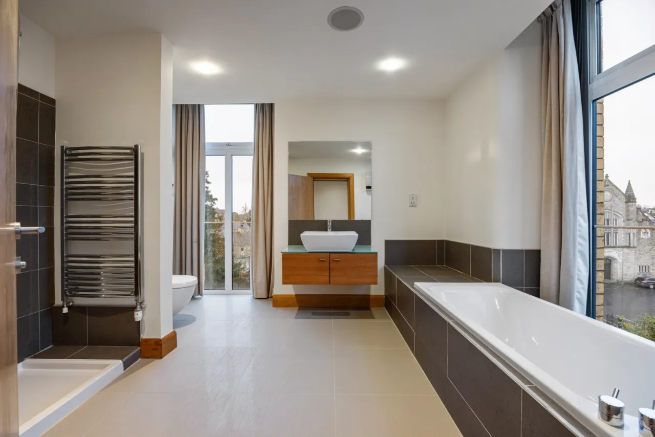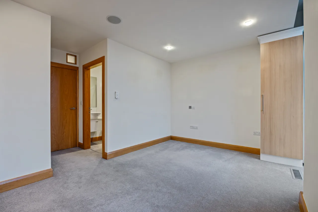 Excellent range of modern built in robes with lighting, concealed Worcester gas boiler, ceiling speakers, recessed spotlighting, two floor to ceiling windows.