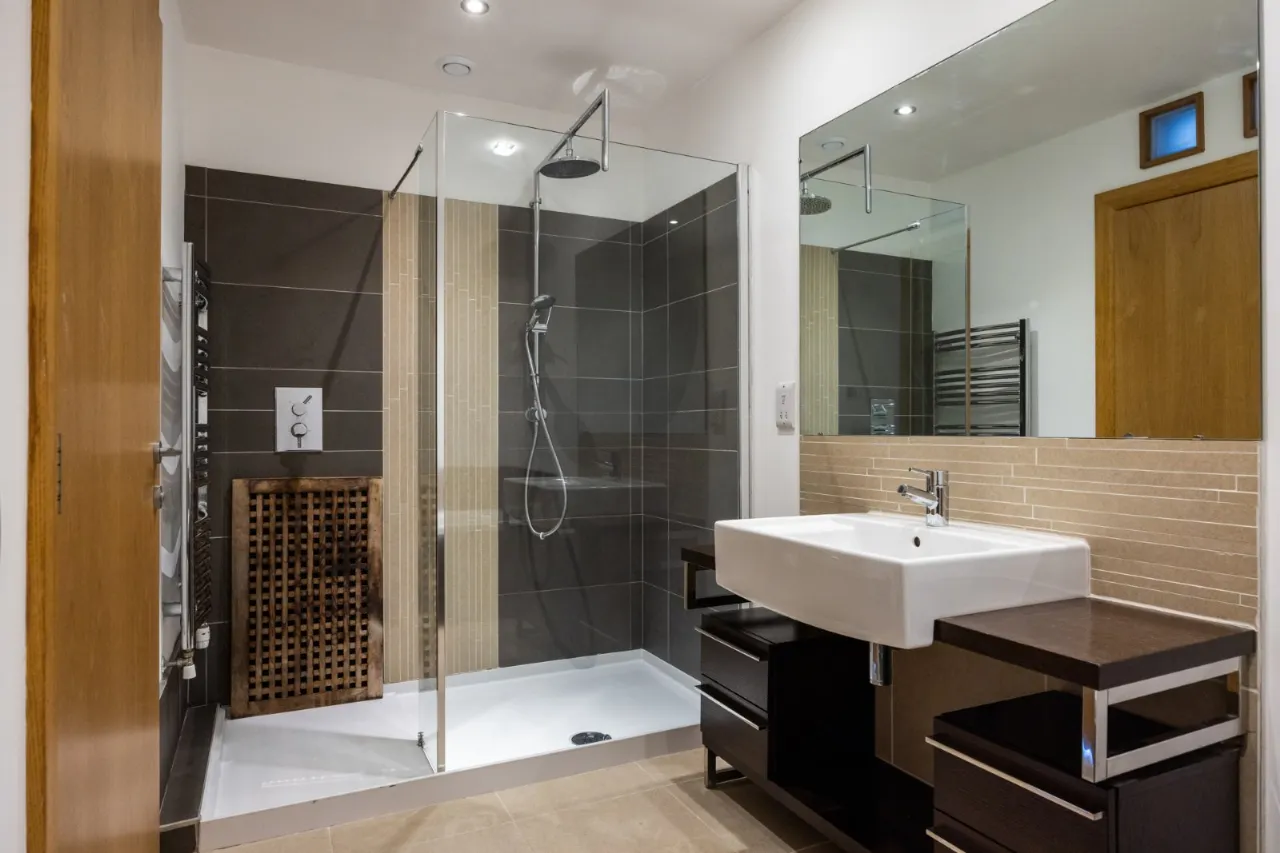 Modern white Villeroy and Boch suite comprising: Large separate fully tiled shower cubicle with thermostatically controlled shower, floating vanity unit with white wash hand basin with mixer taps, push button WC (concealed cistern), chrome towel radiator, recessed spotlighting, full height Westerly facing window, shaver point.