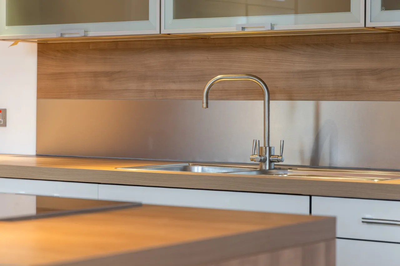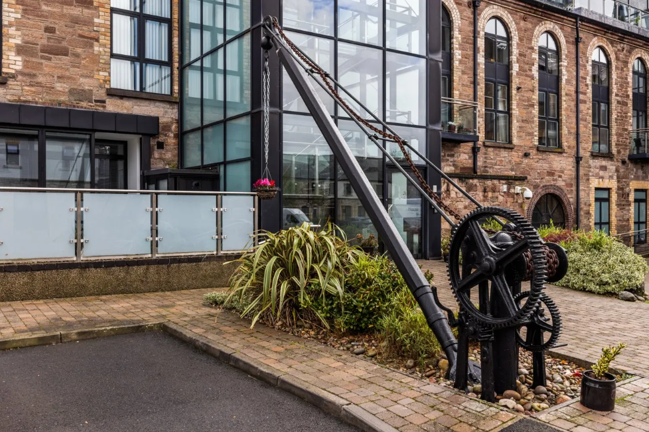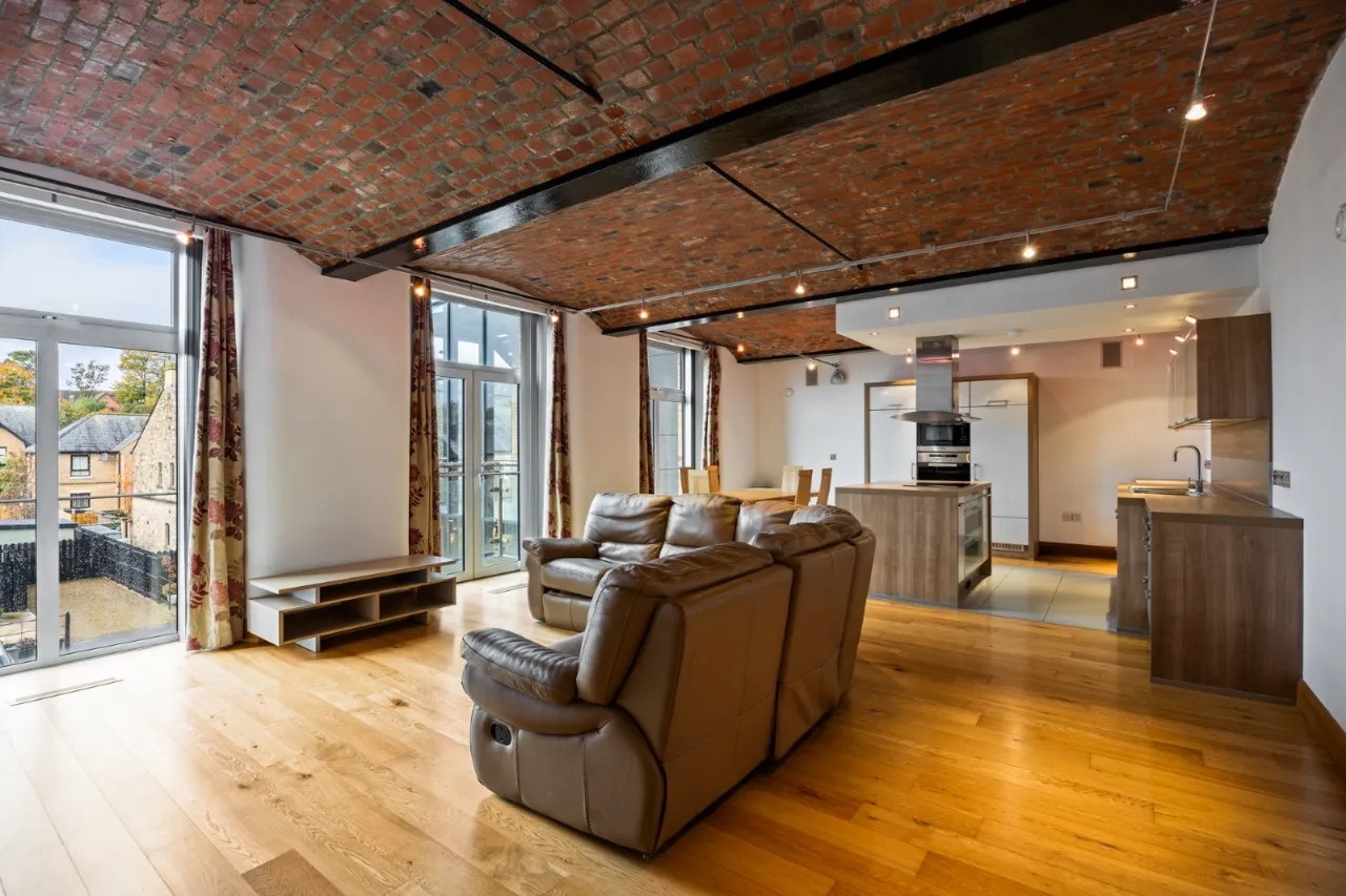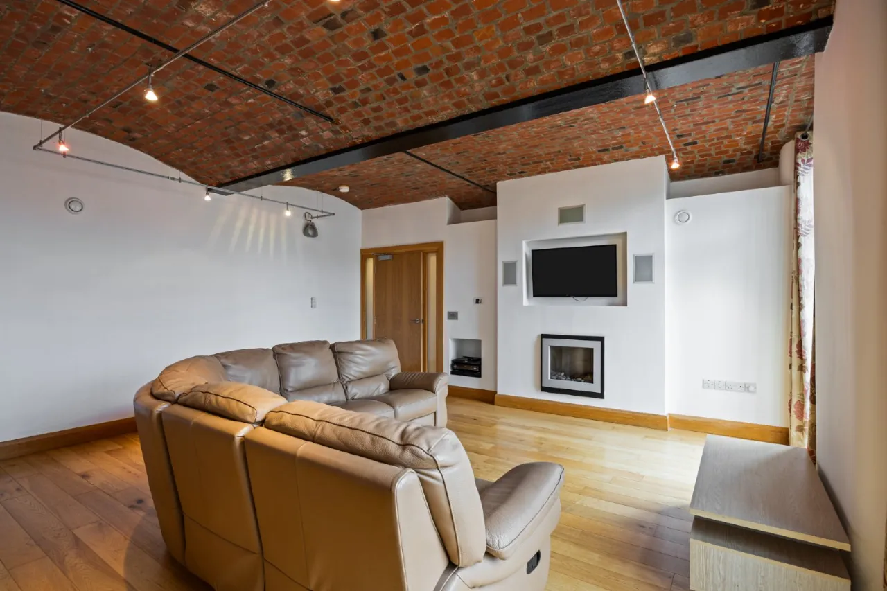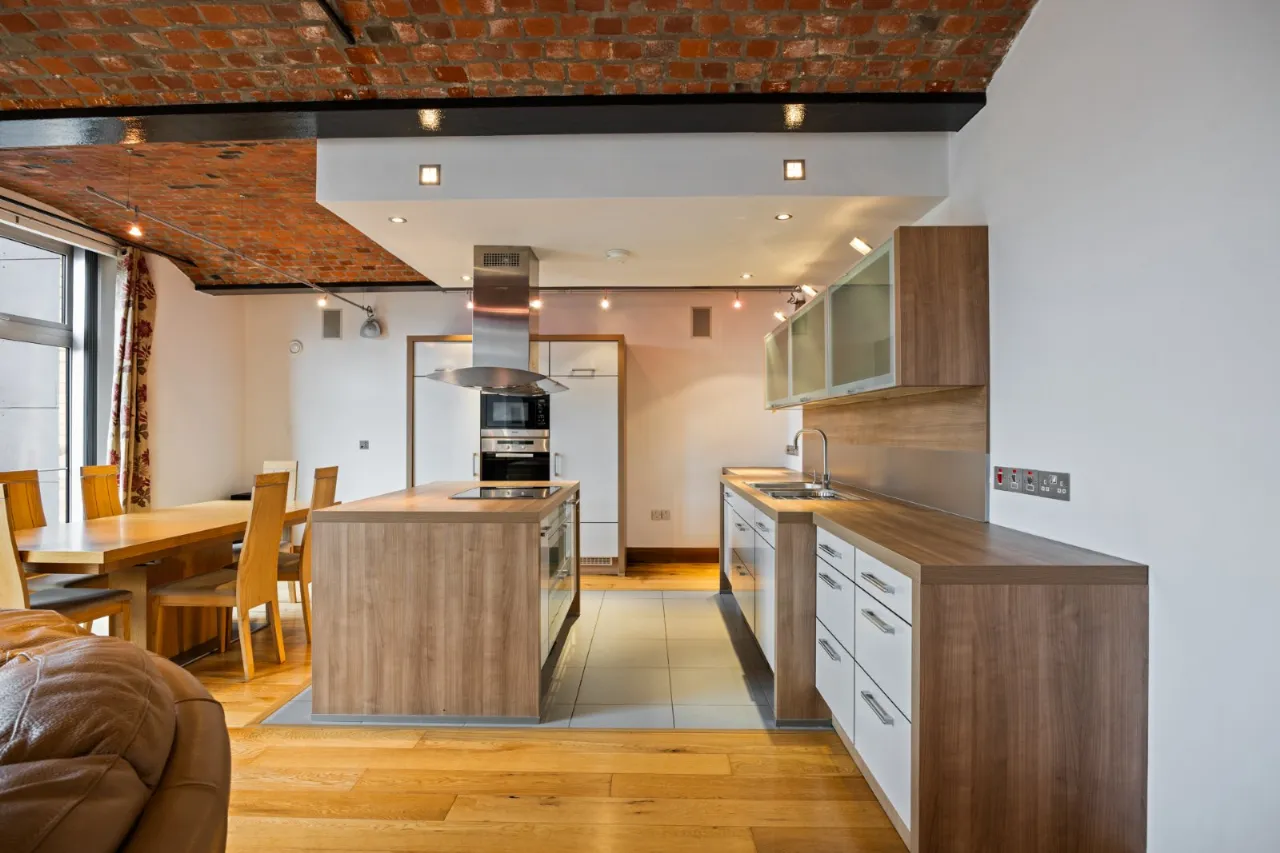 Franke 1.5 tub single drainer stainless steel sink unit with mixer taps, excellent range of high and low level modern units with oak effect Formica roll edge work surfaces, integrated fridge and freezer, oven and dishwasher, microwave (all Miele), integrated washing machine, island with matching units and worktops, glazed pot drawers, Miele induction hob, Neff stainless steel extractor hood, 2 pull out larder drawers and breakfast bar, ceramic tiled floor, polished oak floor, modern lighting scheme, feature wall mounted inset electric fire, recess for wall mounted TV, surround sound system with Panasonic amp, Jamo subwoofer and integral surround sound wall speakers, feature Belfast Brick barrel ceiling, 3 full height Westerly facing windows, French doors to Balcony.