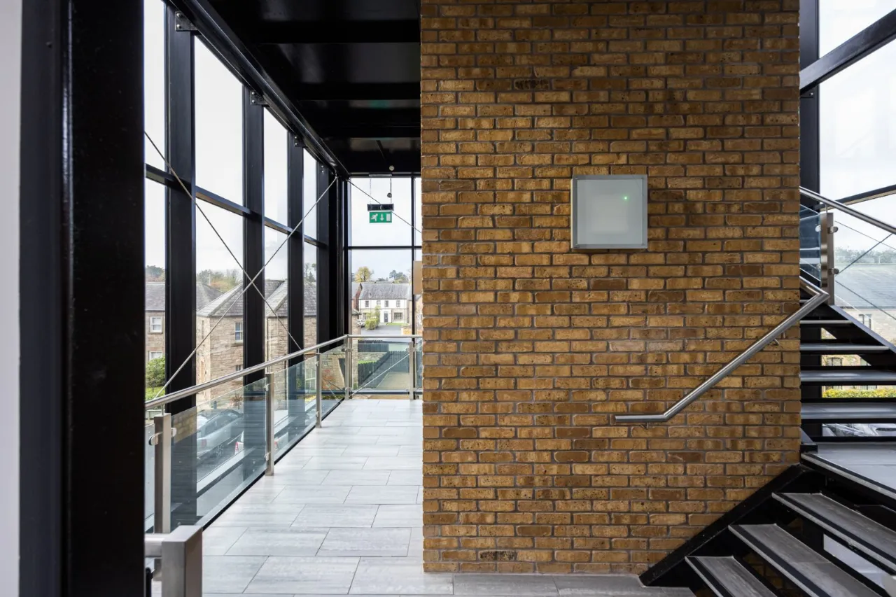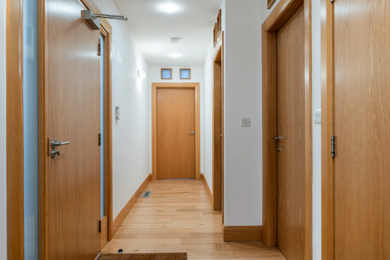 Ceramic tiled floor, recessed spotlighting on sensors leading to solid oak front door with frosted glass sidelights to Apartment 8.