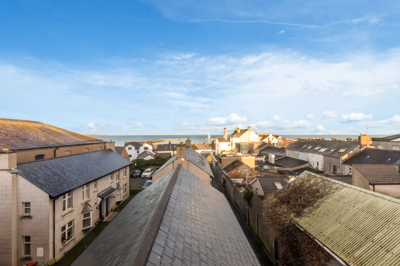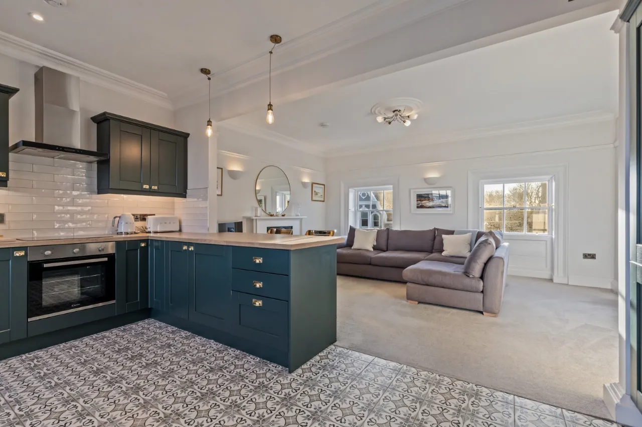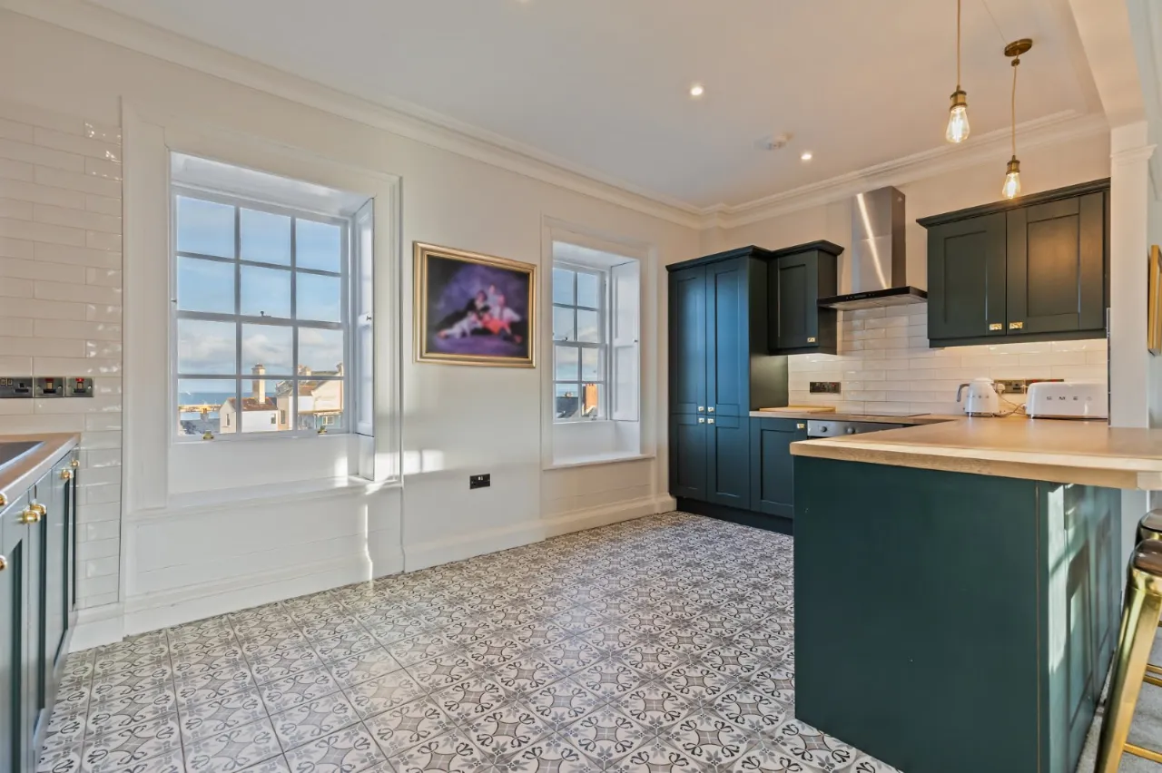 Black Rangemaster 1.5 tub single drainer sink unit with mixer taps, excellent range of high and low level dark green shaker style units, brass effect hardware, 4 ring ceramic hob unit, built in oven, stainless steel extractor hood, integrated fridge freezer, dishwasher and washer dryer, broom cupboard, concealed Worcester Bosch gas boiler, wall tiling, feature period style floor to Kitchen/Dining area, breakfast bar, dual aspect with stunning views over Donaghadee, the Lighthouse and the Irish Sea. Feature mock fireplace with slate hearth, corniced ceiling, ceiling rose, picture rail, wall light points, feature timber window surrounds, LED recessed spotlighting.