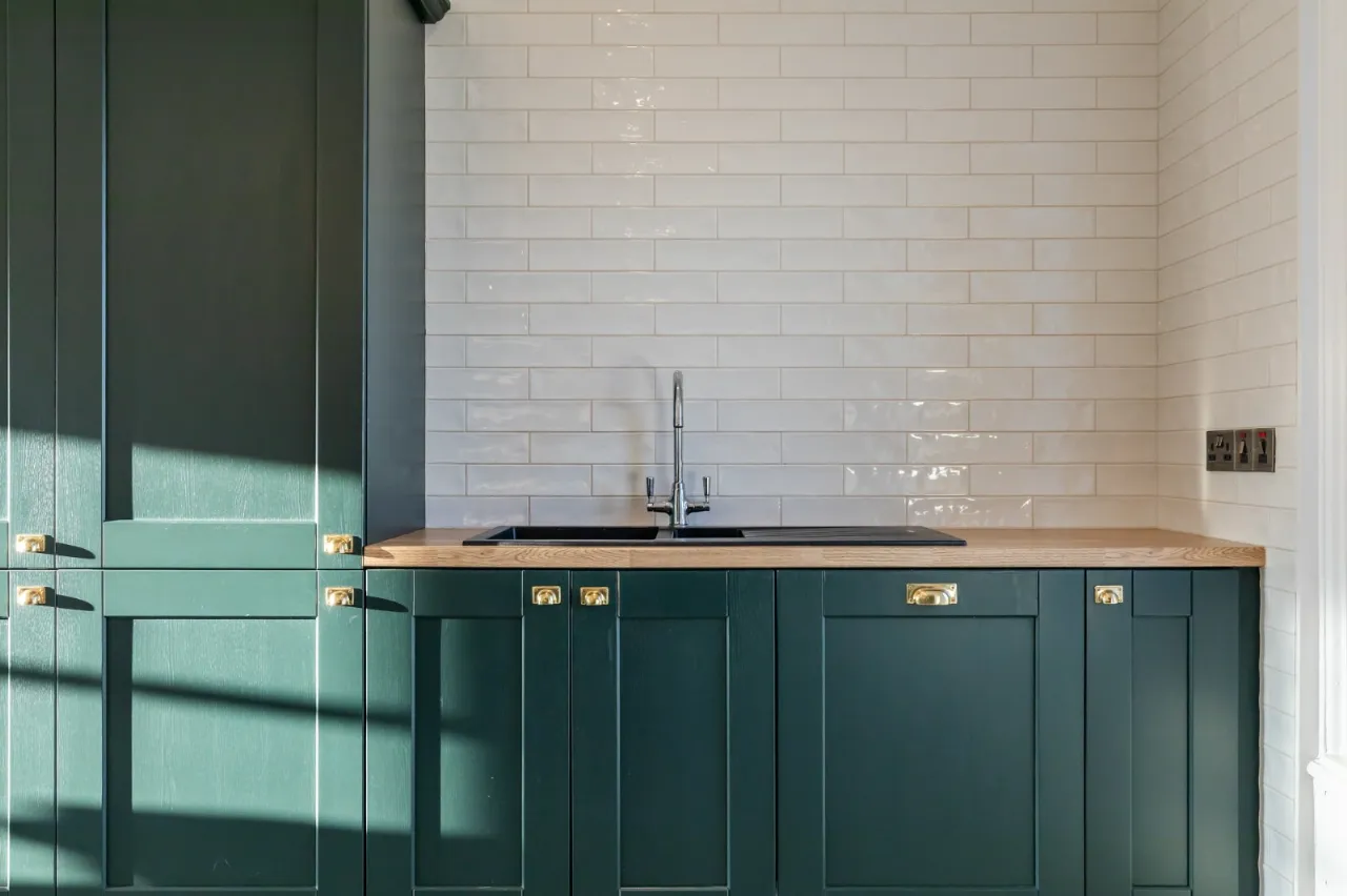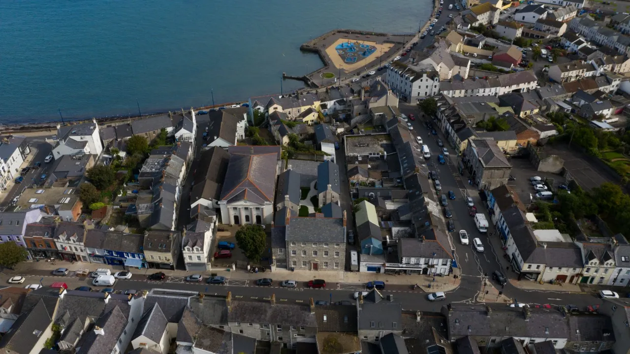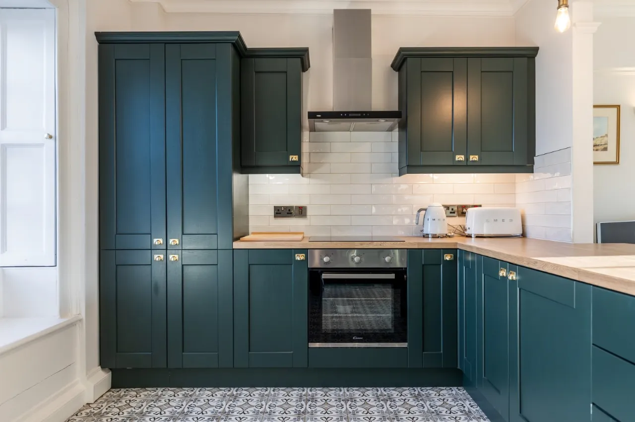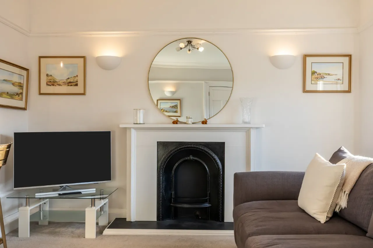 Black Rangemaster 1.5 tub single drainer sink unit with mixer taps, excellent range of high and low level dark green shaker style units, brass effect hardware, 4 ring ceramic hob unit, built in oven, stainless steel extractor hood, integrated fridge freezer, dishwasher and washer dryer, broom cupboard, concealed Worcester Bosch gas boiler, wall tiling, feature period style floor to Kitchen/Dining area, breakfast bar, dual aspect with stunning views over Donaghadee, the Lighthouse and the Irish Sea. Feature mock fireplace with slate hearth, corniced ceiling, ceiling rose, picture rail, wall light points, feature timber window surrounds, LED recessed spotlighting.