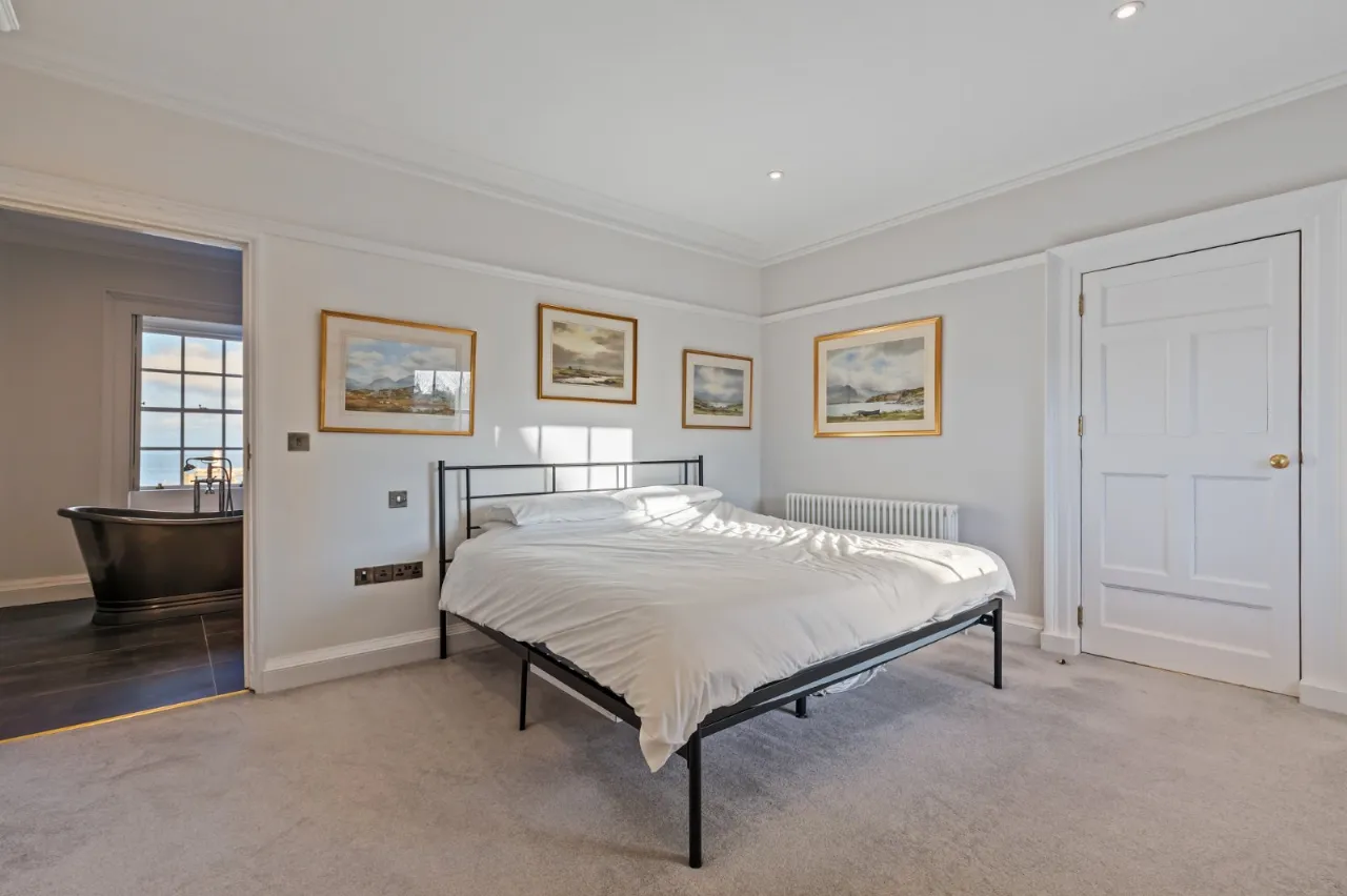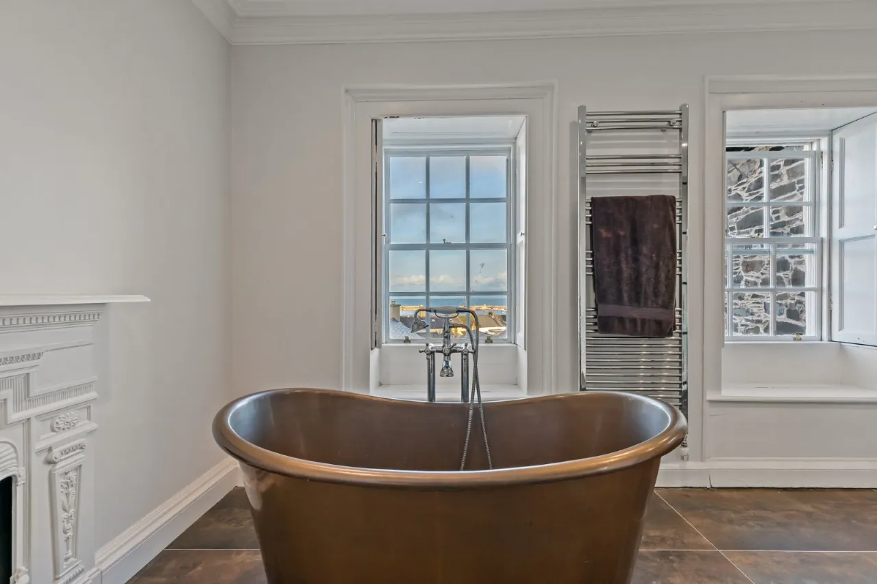 Feature freestanding copper roll top bath with mixer taps and telephone hand shower over, large wal in separate fully tiled shower cubicle with thermostatically controlled shower, rain head and telephone hand shower, glass panel, painted timber vanity floor stand, Roca wash hand basin with mixer taps, Roca low flush WC, feature wall tiling, Porcelain tiled floor, two large chrome towel radiators, mock cast iron fireplace surround, corniced ceiling, LED recessed spotlighting, extractor fan, stunning views over Donaghadee, the Lighthouse, Irish Sea, feature timber window surrounds.