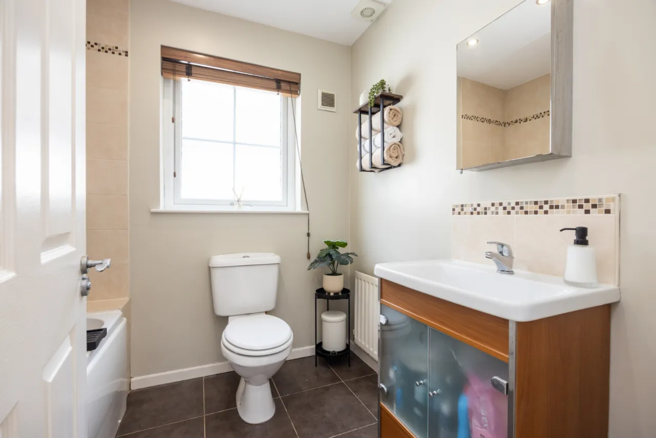 White suite comprising: Panelled bath with mixer taps and thermostatic shower, vanity sink unit with mixer taps, low flush WC, partly tiled walls, ceramic tiled floor.