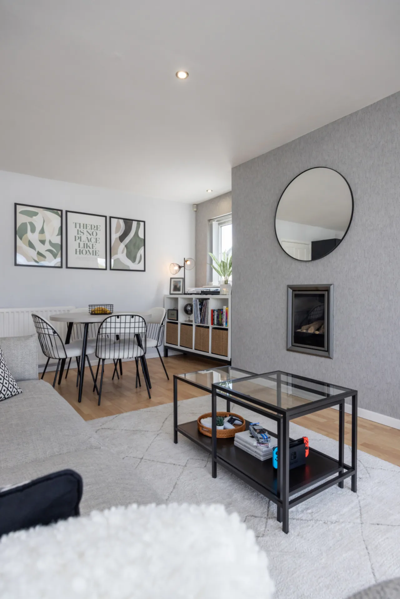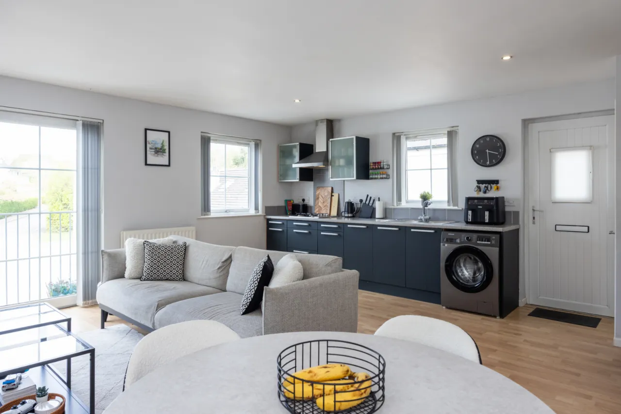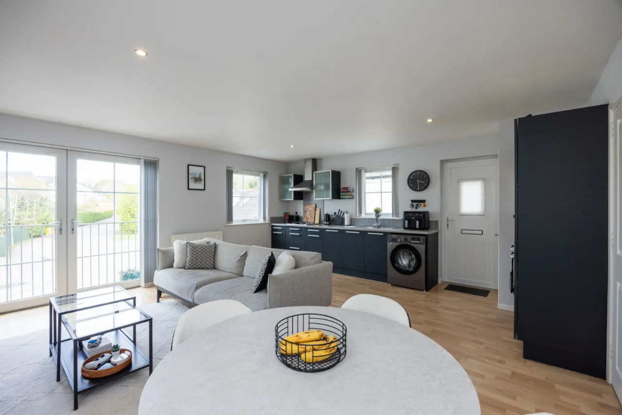 The layout comprises two generous bedrooms, a contemporary bathroom fitted with a modern white suite, and a standout open-plan living space. The spacious lounge seamlessly flows into a dining area and modern fitted kitchen, creating an ideal setting for both relaxing and entertaining.