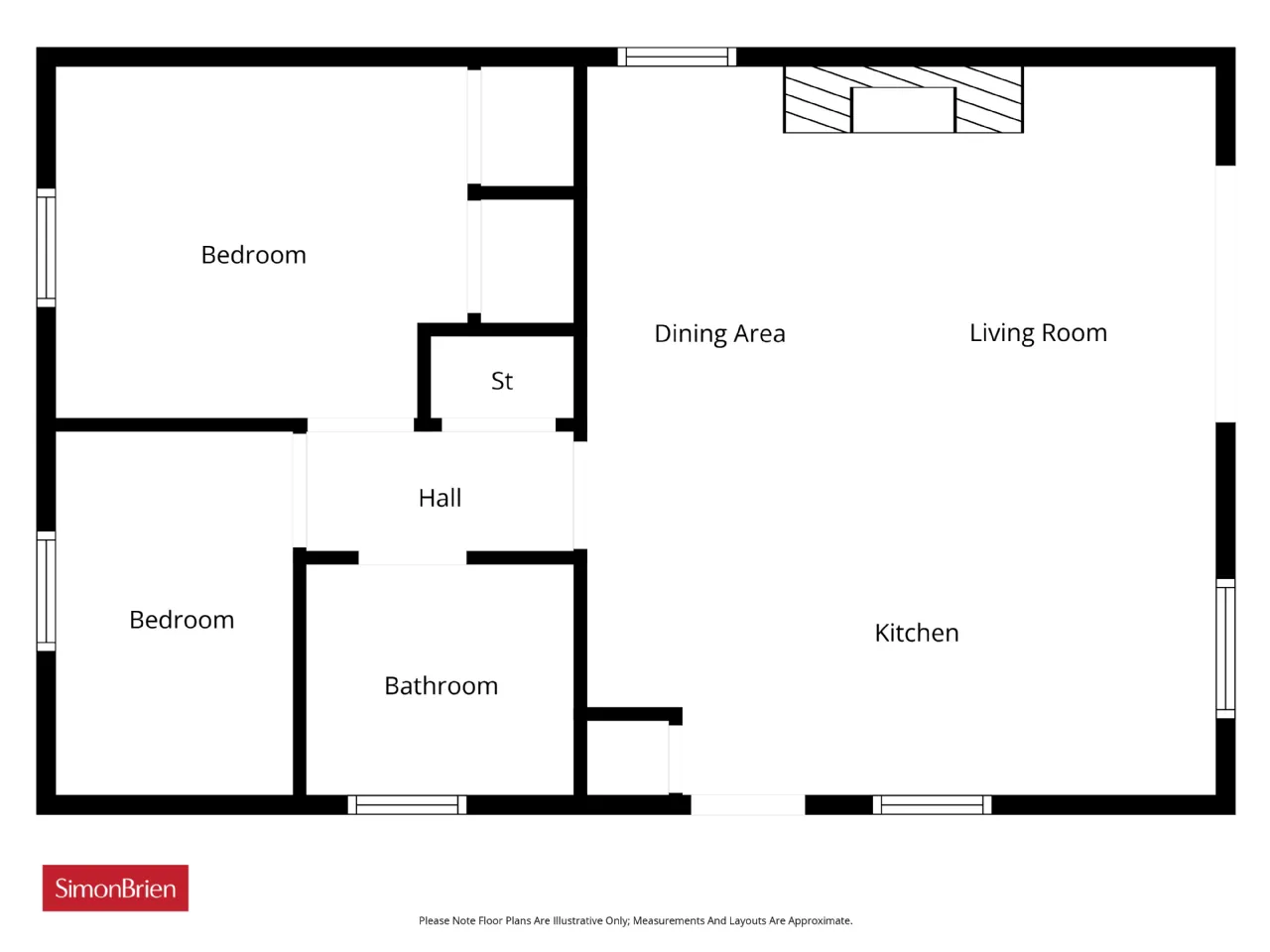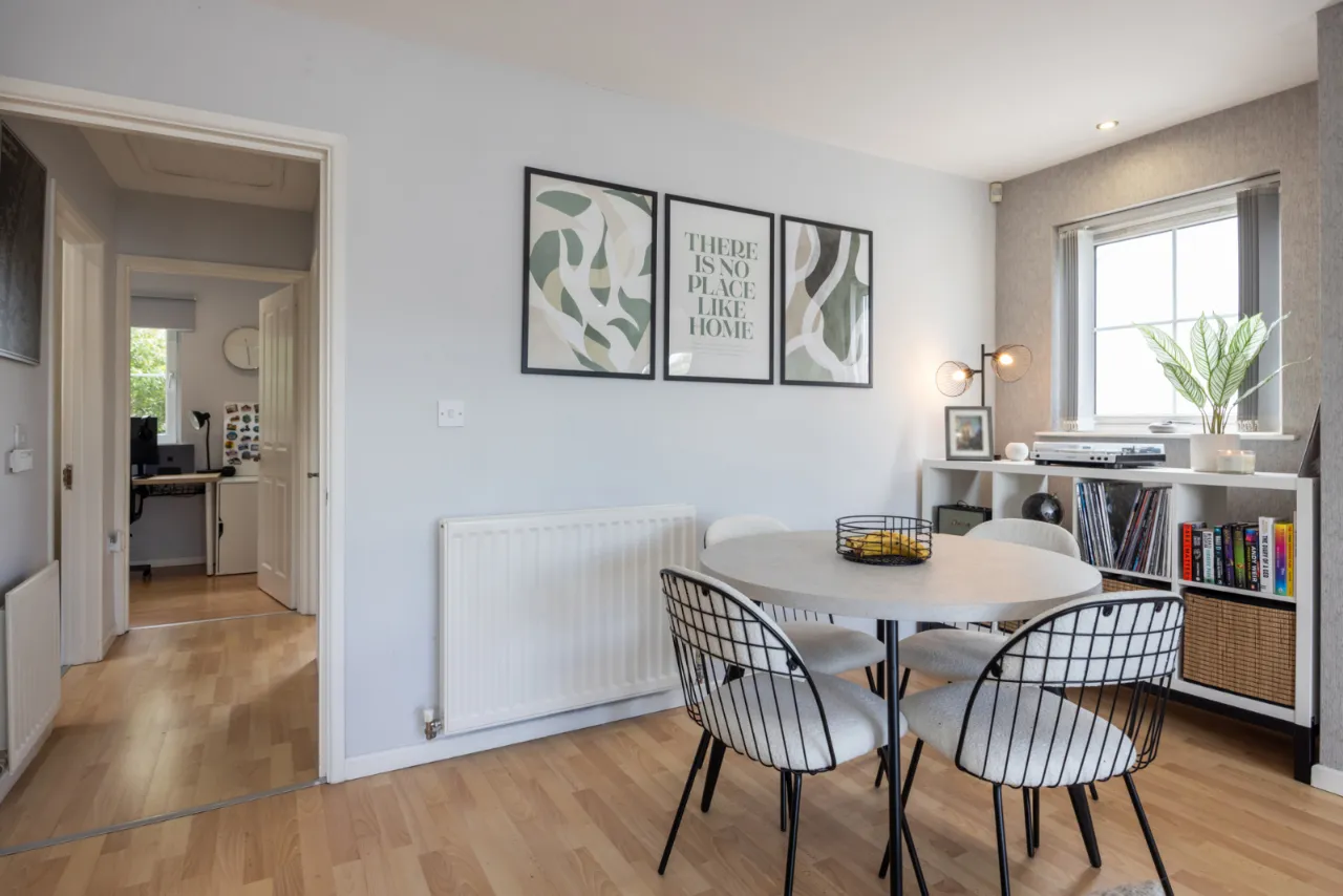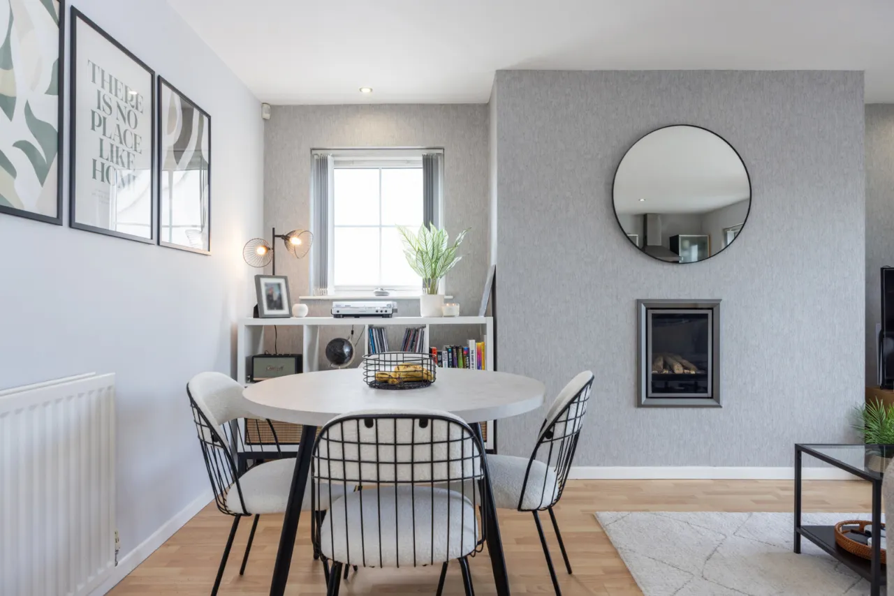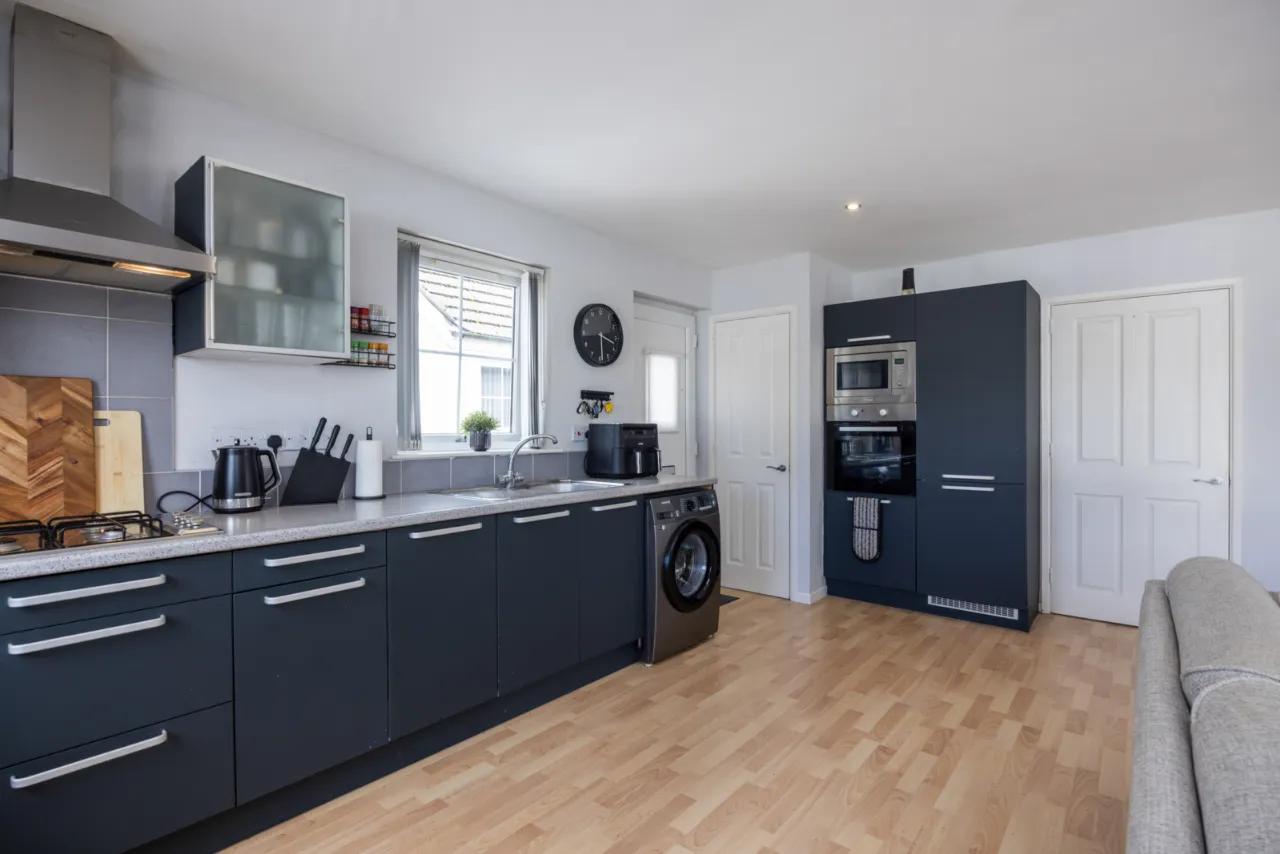 The layout comprises two generous bedrooms, a contemporary bathroom fitted with a modern white suite, and a standout open-plan living space. The spacious lounge seamlessly flows into a dining area and modern fitted kitchen, creating an ideal setting for both relaxing and entertaining.