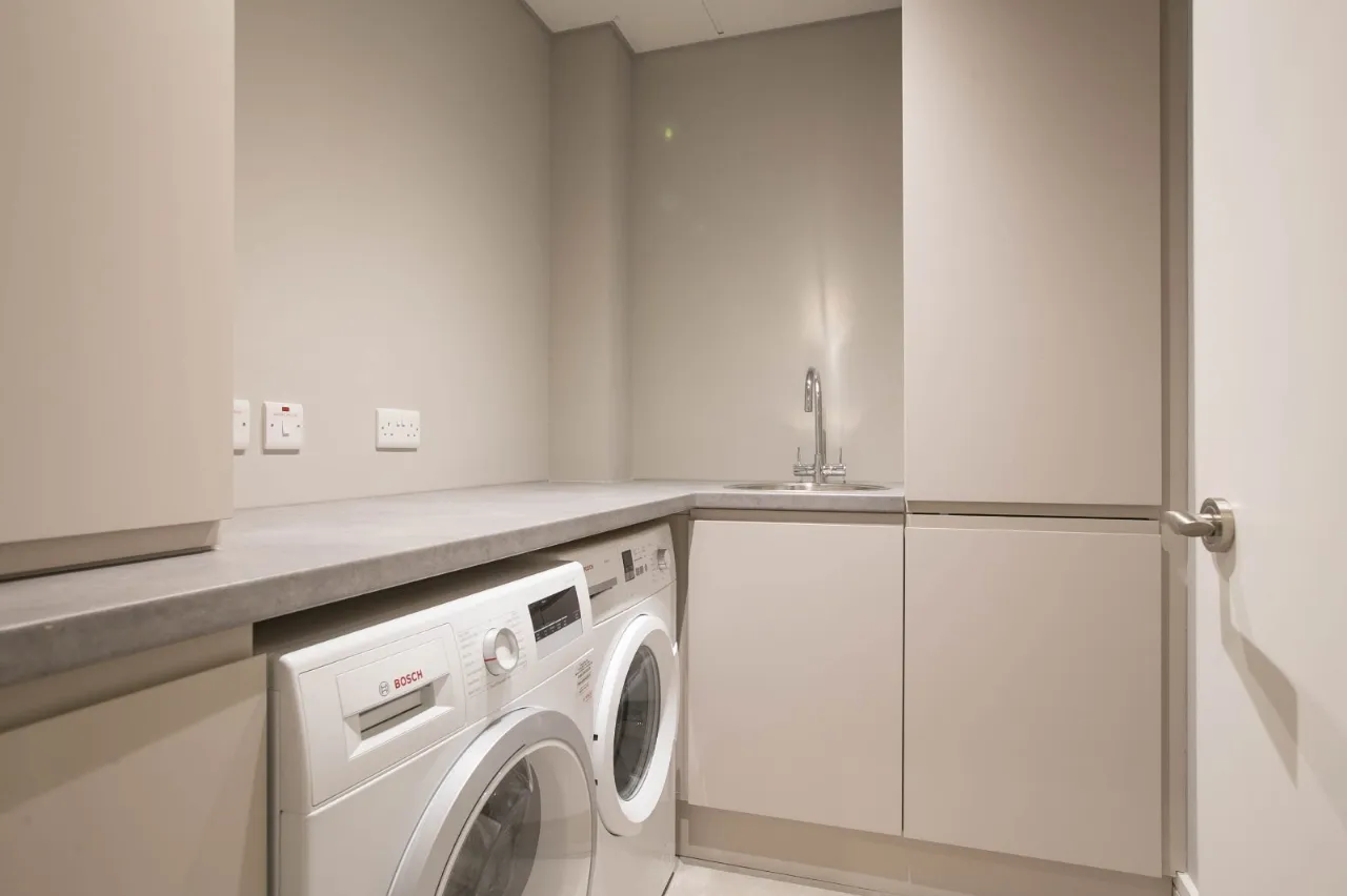 Good range of fitted units. Stainless steel sink unit with mixer taps. Plumbed for washing machine. Ducted for tumble dryer. Concealed gas boiler. Tiled floor. Recessed lighting.