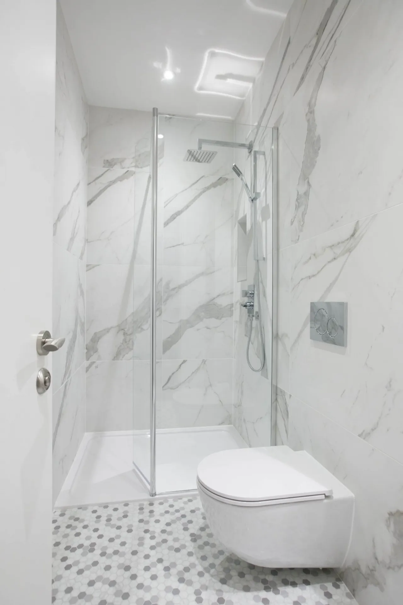 Low flush WC, walk in shower with telephone hand shower and rainfall inset shower, wall hung dual flush WC, wash hand basin in vanity unit, chrome heated towel rail.