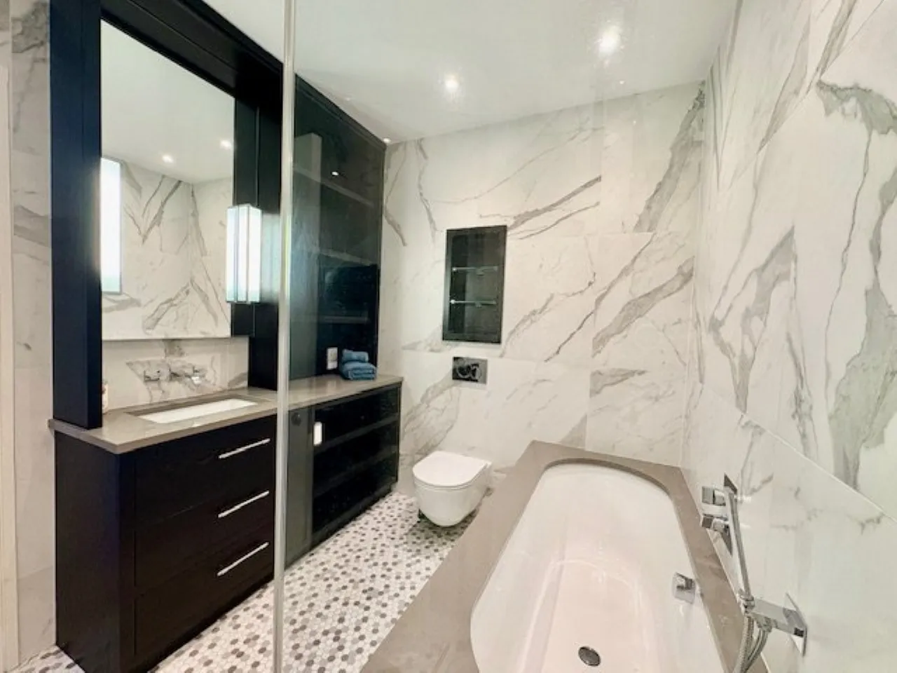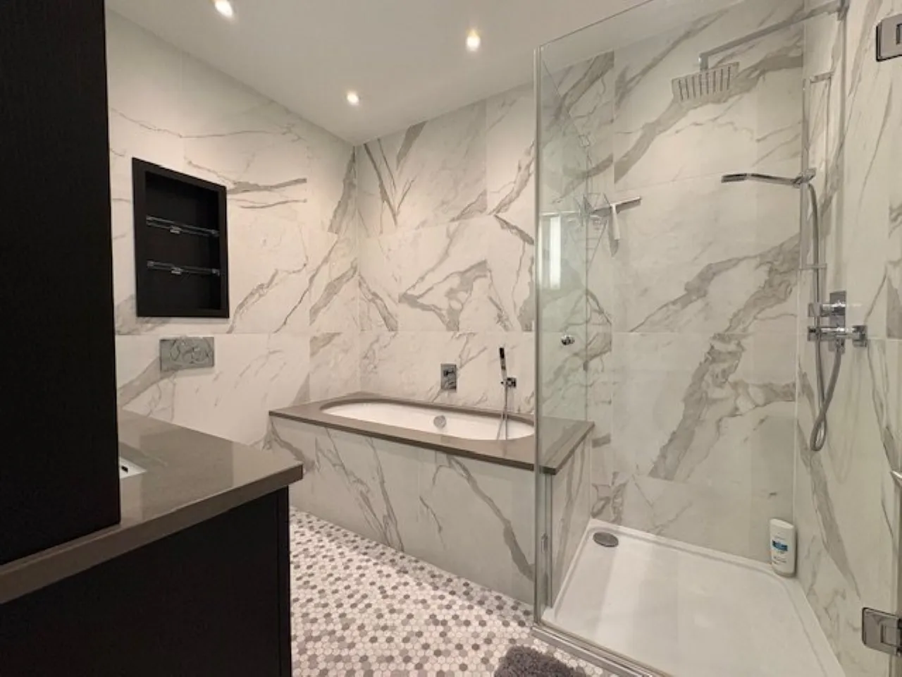Luxury suite comprising built in shelving and drawers with inset wash hand basin Sinquastone graphic grey worktops and mixer taps, fully tiled shower enclosure with feature rainfall shower and hand held fitments, tiled inset feature bath with telephone hand shower, feature tiled floor, fully tiled walls, recessed lighting, chrome heated towel rail.