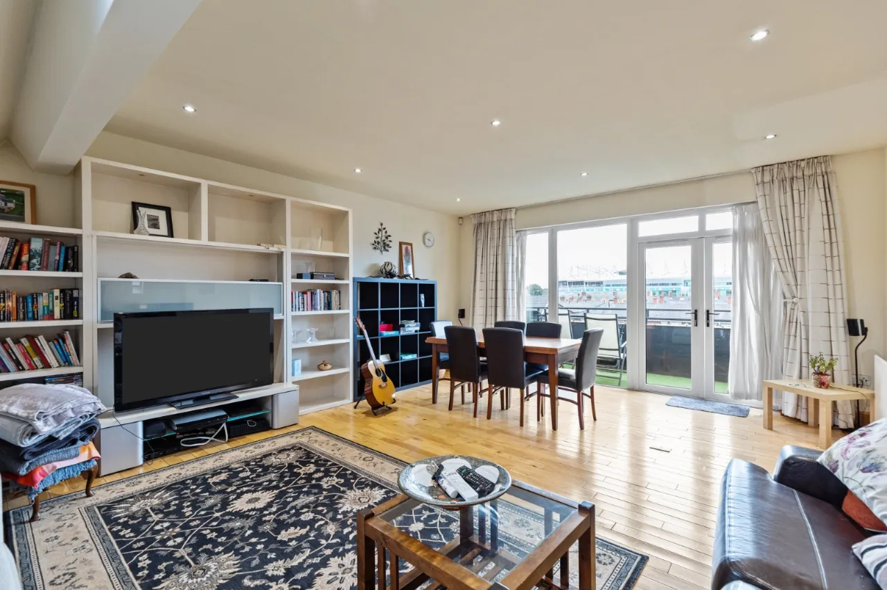 Solid white oak flooring. Patio doors to south facing balcony with decking, planting and pots.