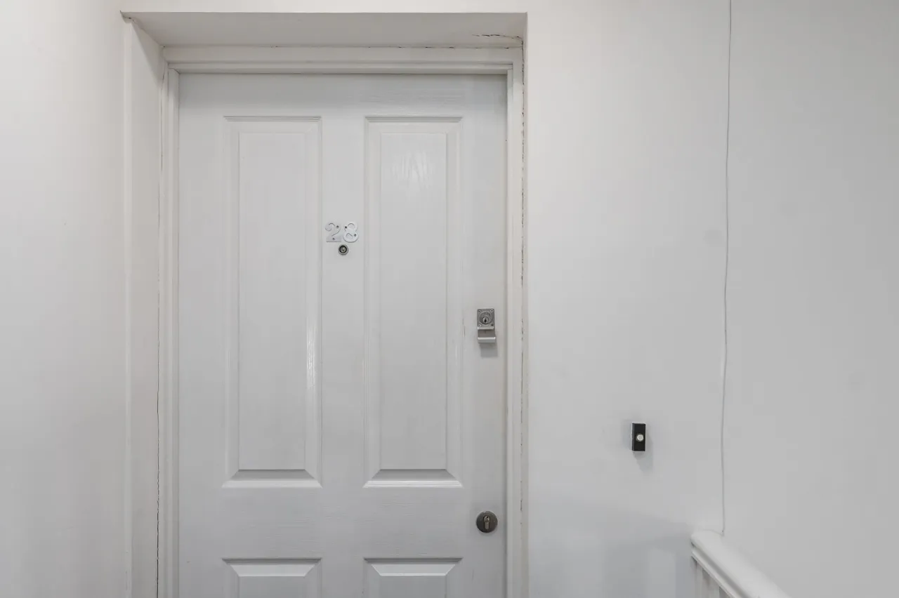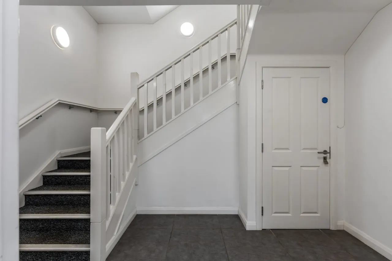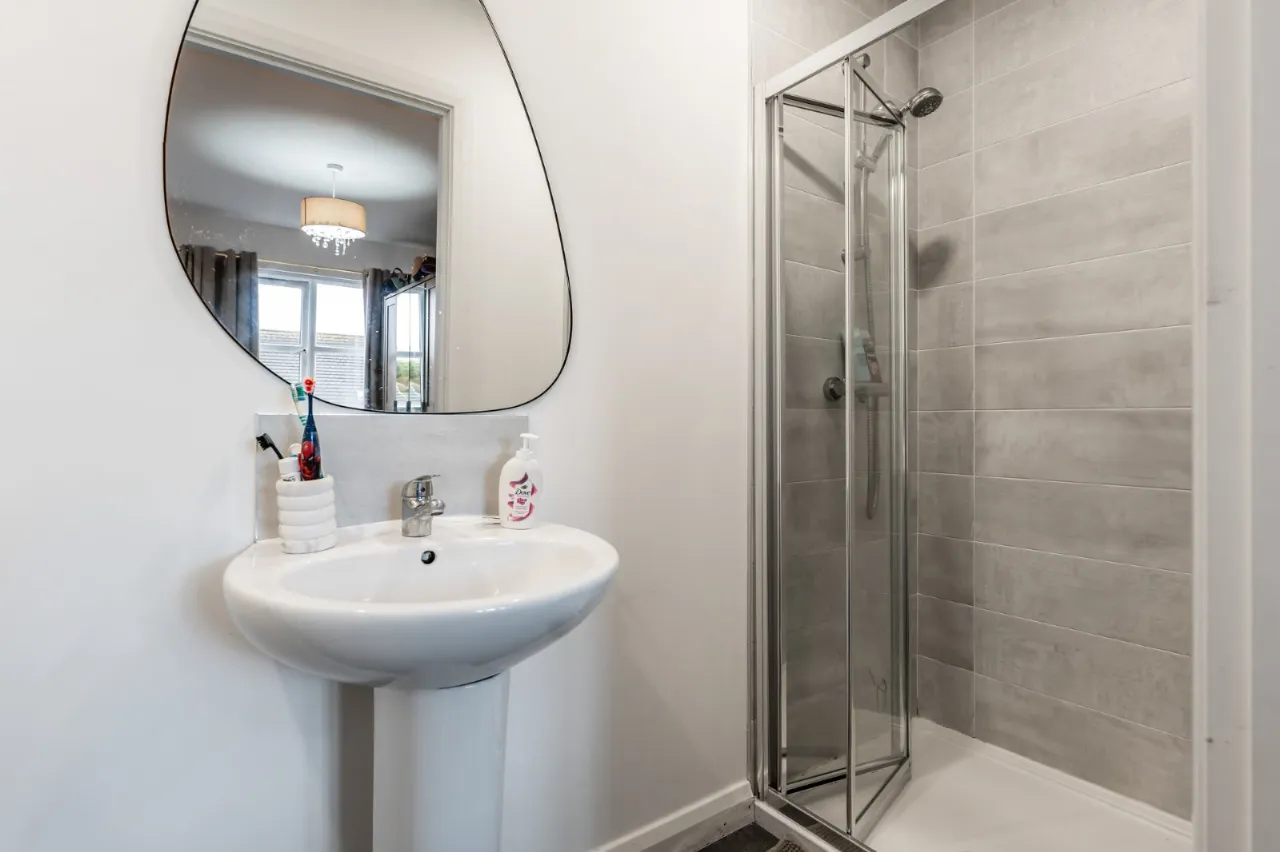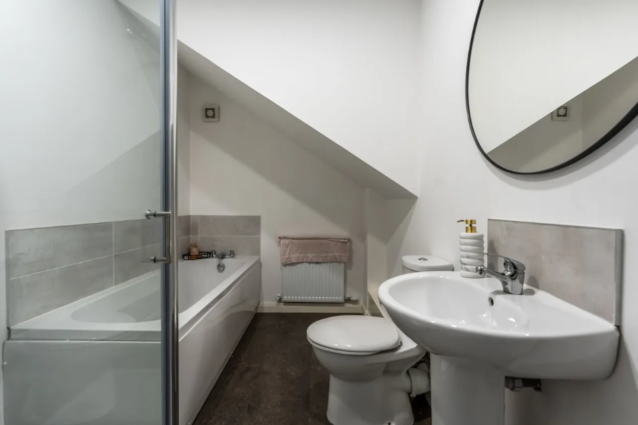 Modern white suite comprising: separate fully tiled shower cubicle with thermostatically controlled shower, pedestal wash hand basin with mixer taps, push button WC, chrome towel radiator, LED recessed spotlighting, extractor fan, polished laminate floor.