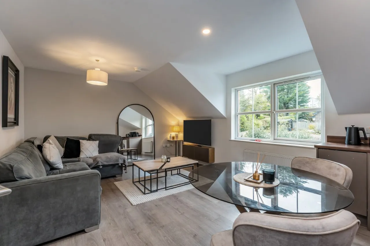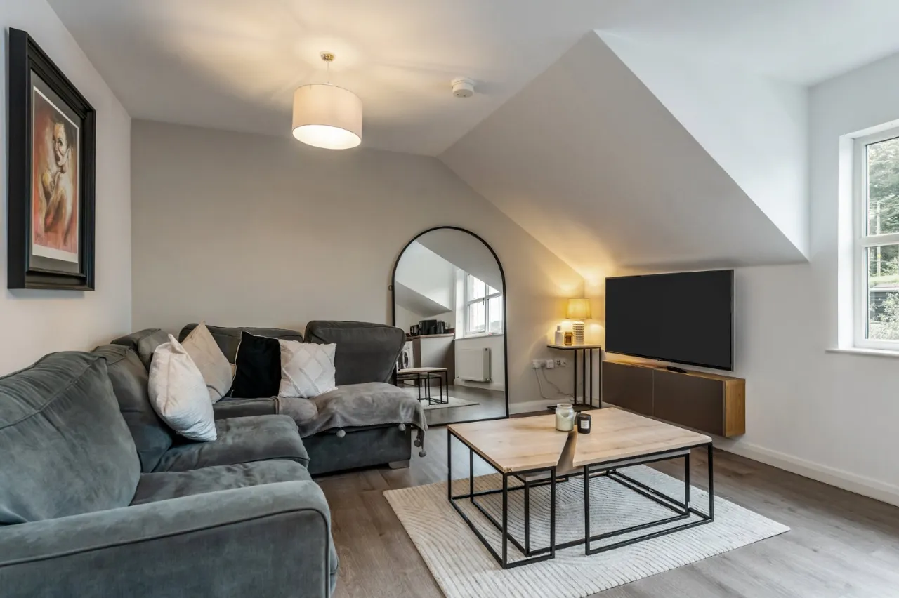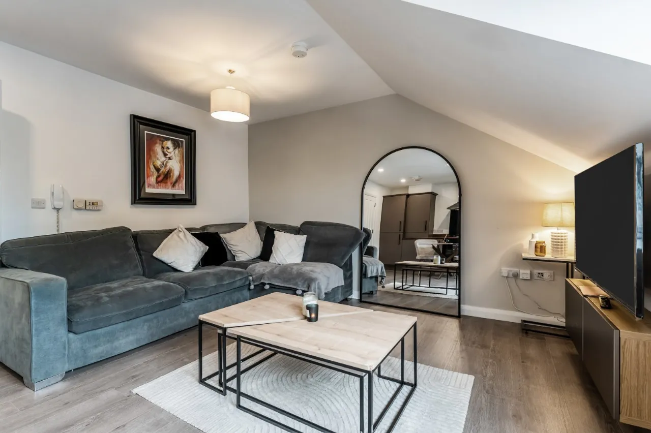 1.5 tub single drainer stainless steel sink unit with mixer taps, excellent range of hind low level Walnut coloured modern units, wood effect Formica roll edge work surfaces, 4 ring gas hob unit, built in oven, stainless steel extractor hood, black glass splashback, integrated fridge and dishwasher, plumbed for washing machine, concealed gas boiler, polished laminate floor, TV and telephone points, view over Belfast side of Newtownards, intercom handset, LED recessed spotlighting. Storage cupboard.
