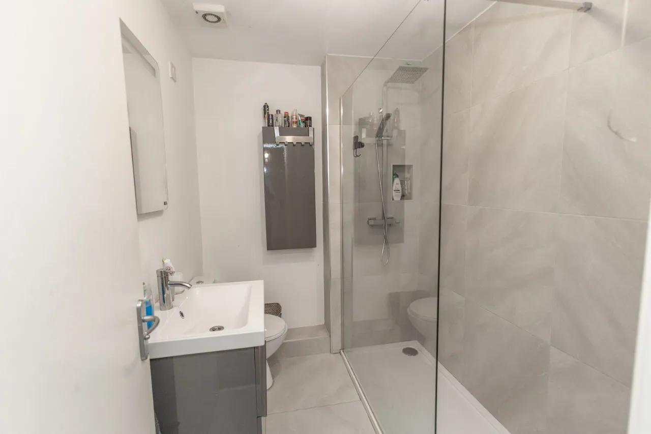 Tiled flooring. Partially tiled walls. Shower unit and thermostat shower. Sink with vanity unit. Low flush wc. Wall mounted mirror.