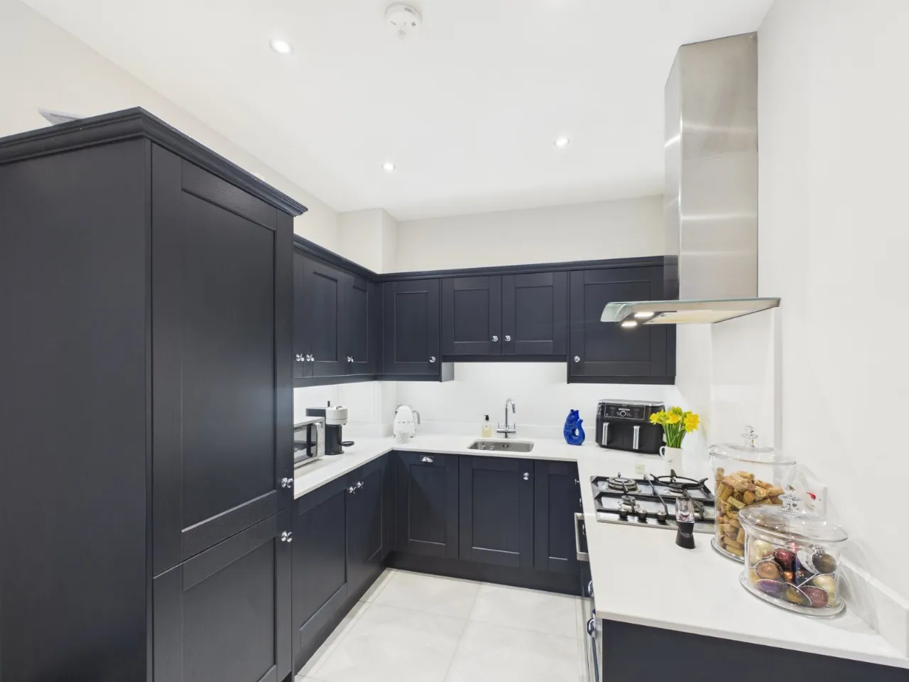 Full range of high and low level units with Quartz work surfaces, 4 ring stainless steel gas hob and under oven, stainless steel extractor canopy over, stainless steel single drainer sink unit with mixer taps, dishwasher and fridge freezer.