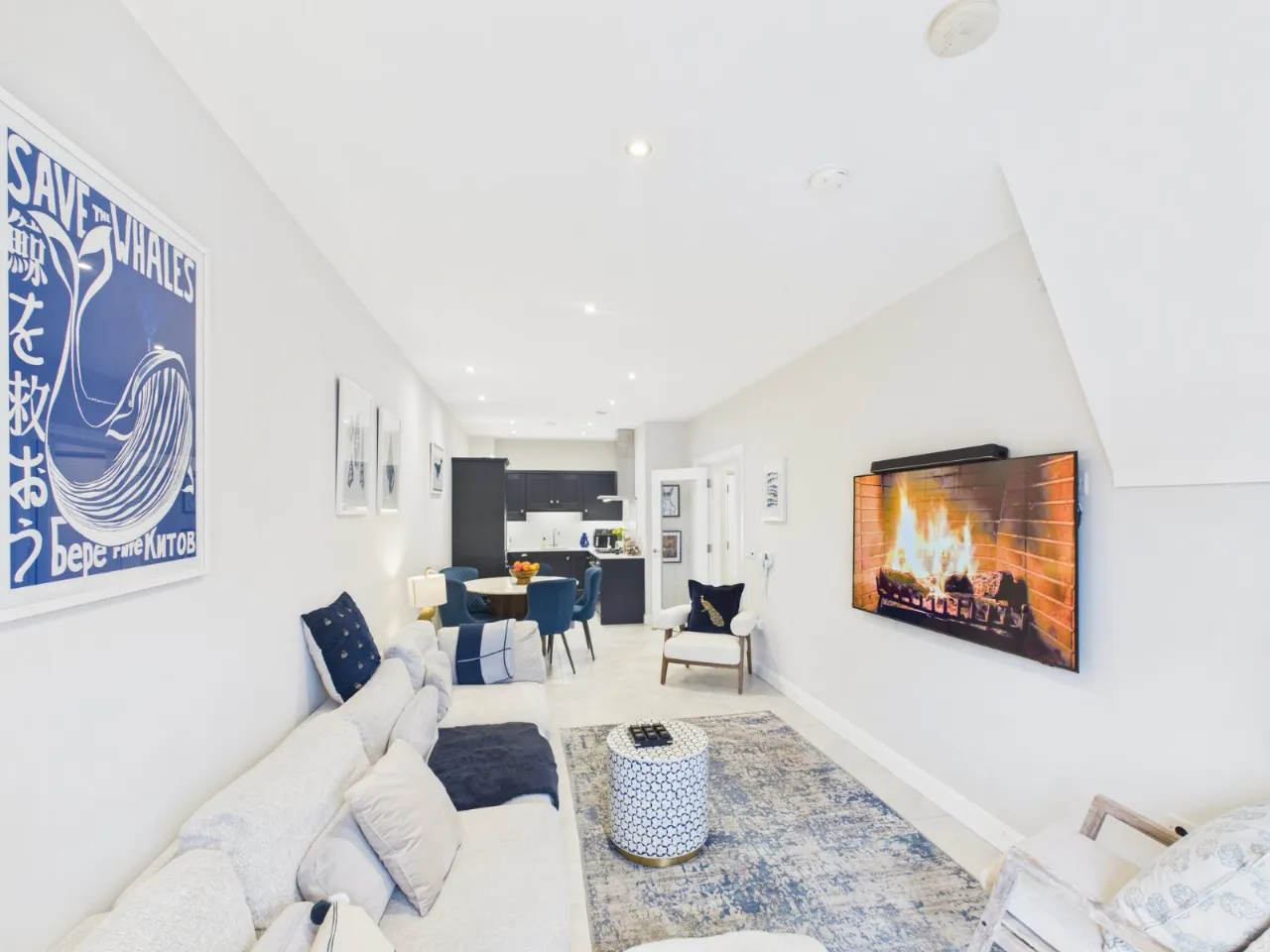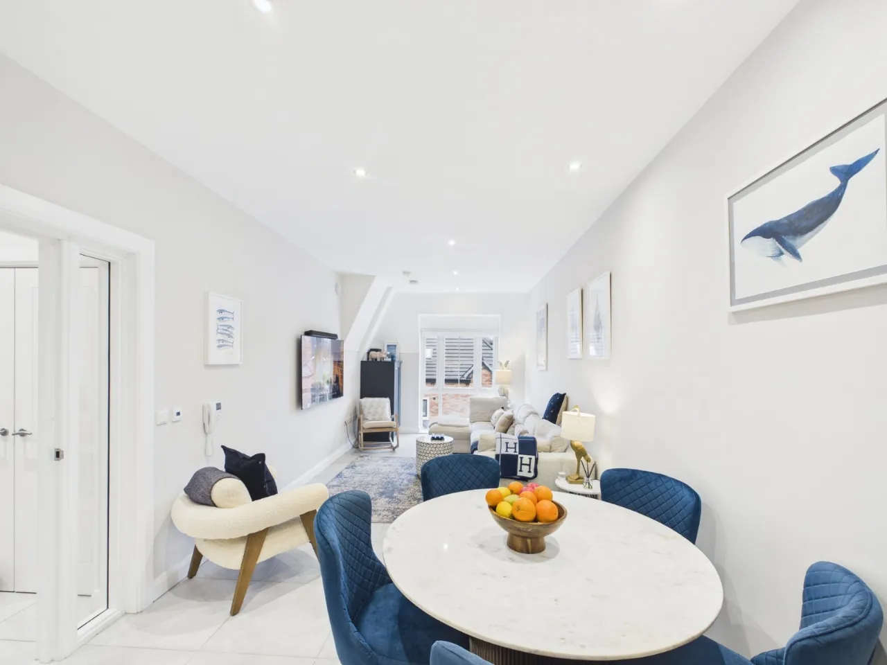 The apartment features a spacious open-plan kitchen, living and dining area, designed to maximise natural light and create a comfortable, sociable living space. The contemporary kitchen is neatly integrated, offering ample storage and a range of integrated appliances, while the living and dining areas provide flexibility for both everyday living and entertaining.
