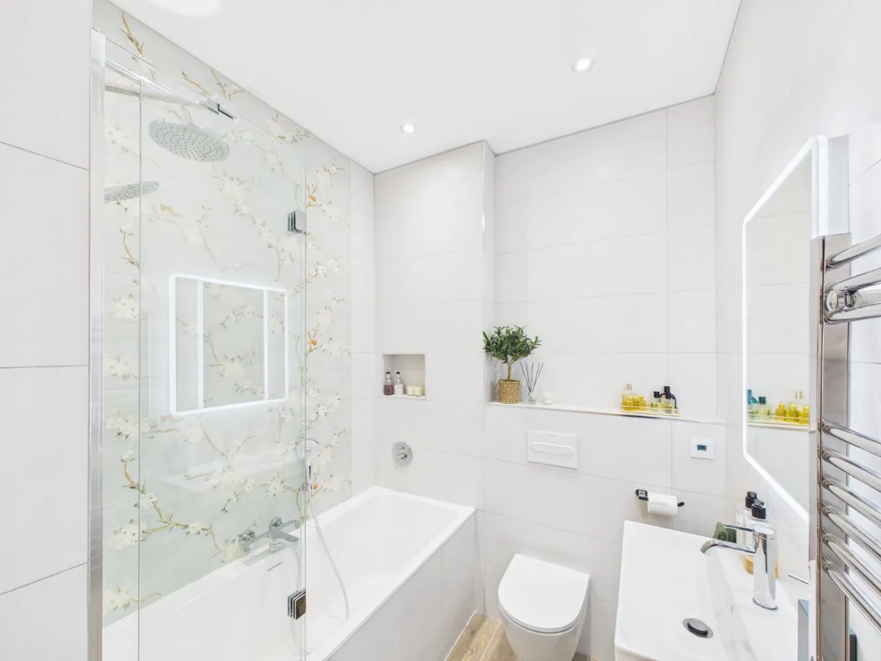 White suite comprising: panelled bath with mixer taps and overhead rain shower, low flush WC, vanity sink unit with mixer taps, partly tiled walls, ceramic tiled floor, chrome towel radiator.