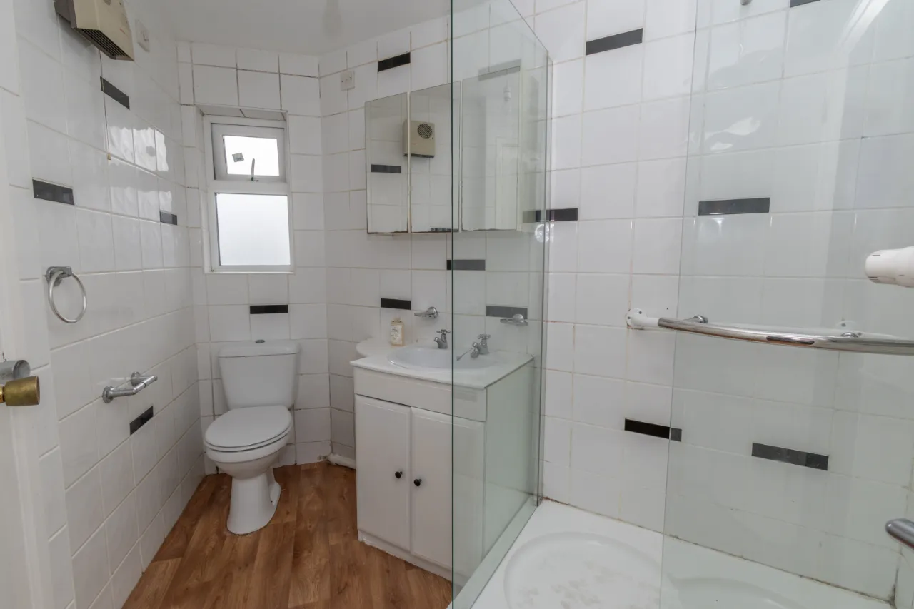 Walk-in Shower. Sink basin with cupboard underneath. W.C. Heated towel radiator. Wooden flooring. Fully tiled walls. Wall mounted mirror/unit.