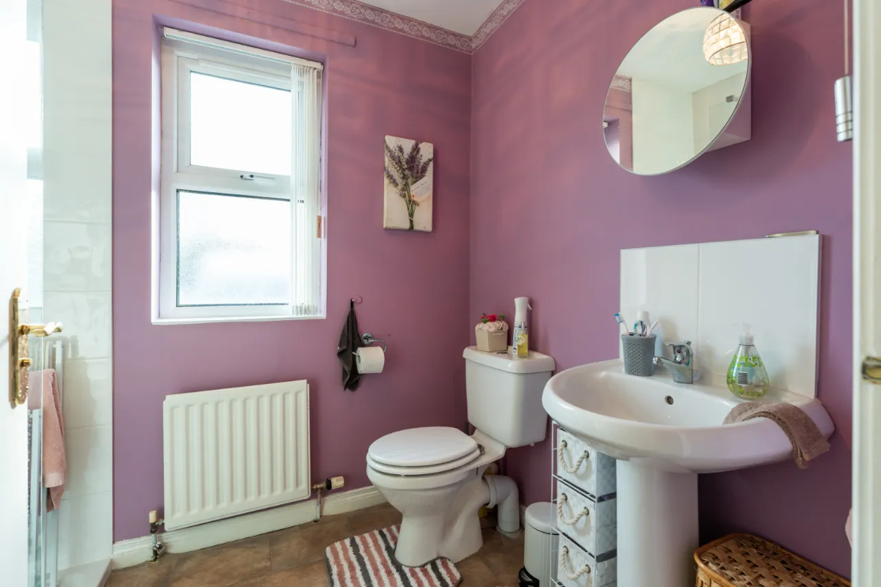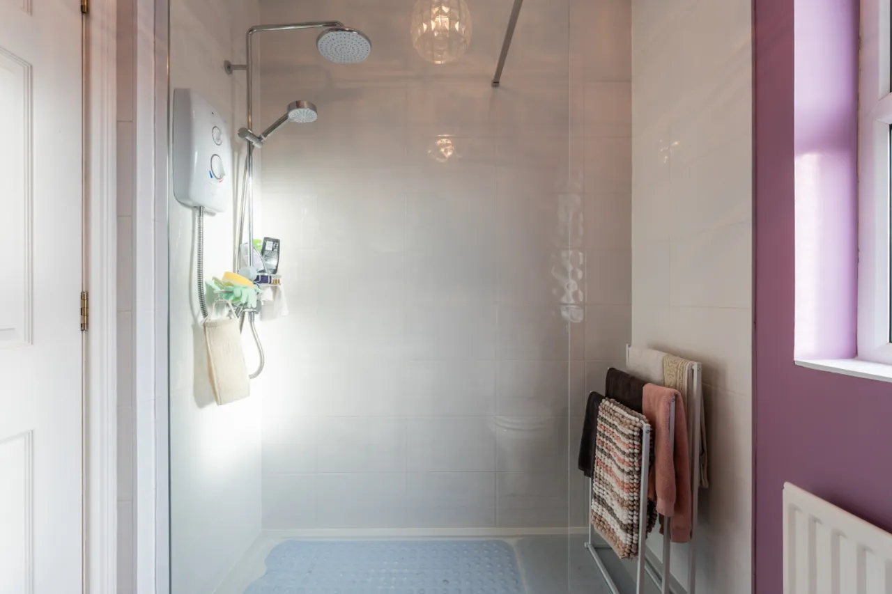 Modern white suite comprising: Large separate fully tiled shower cubicle with glass panel, Mira thermostatically controlled shower unit, pedestal wash hand basin with mixer taps, push button WC, wall tiling, extractor fan.