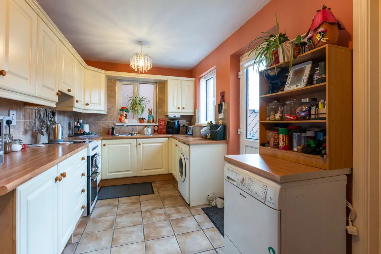 Single drainer stainless steel sink unit with mixer taps, excellent range of high and low level shaker style units, wood effect Formica roll edge work surfaces, recess for cooker, plumbed for washing machine, extractor fan, wall tiling, ceramic tiled floor, uPVC double glazed door to rear.