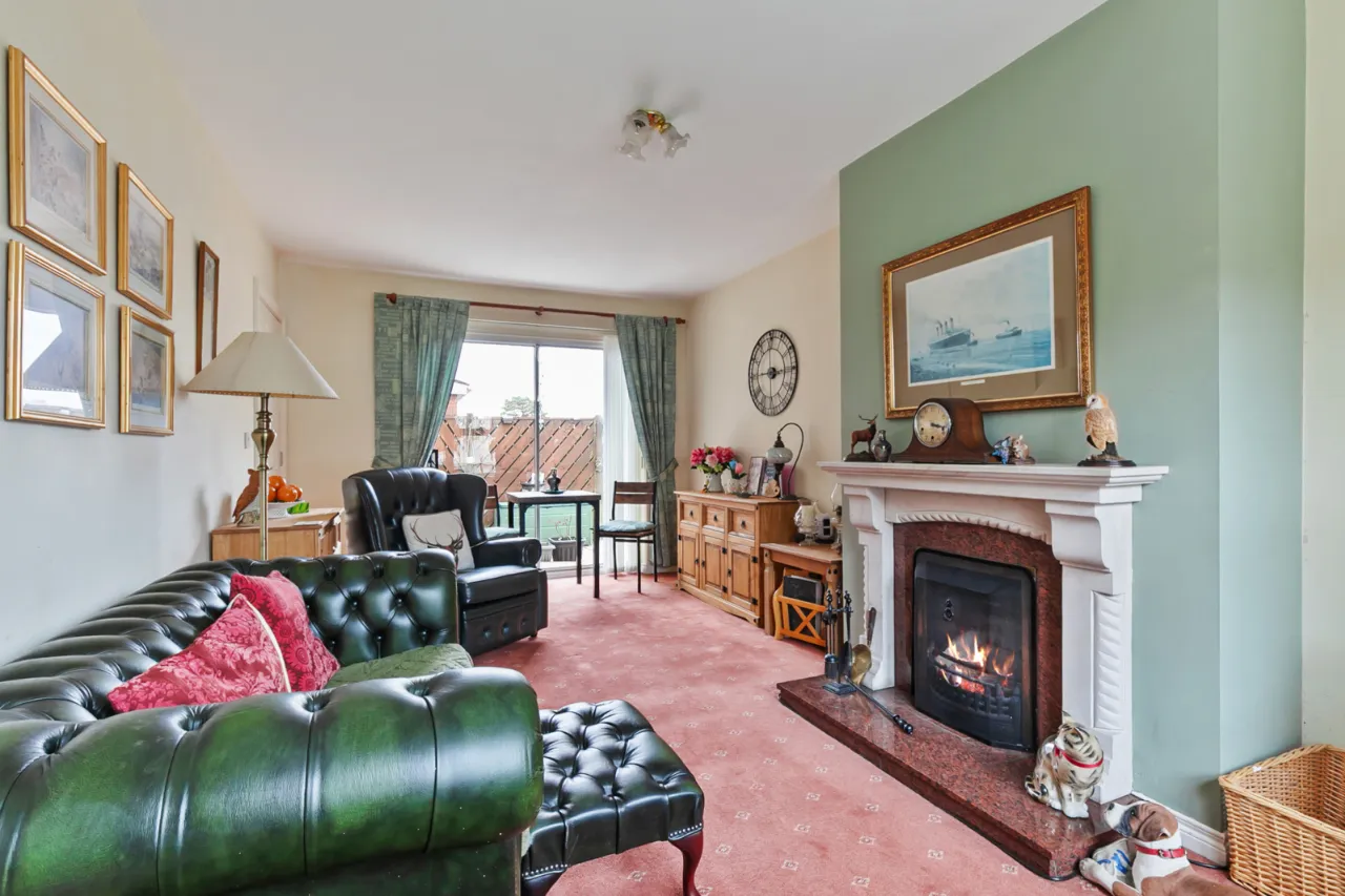 Feature marble fireplace surround with granite inset and hearth, open fire, dual aspect, patio doors to rear.