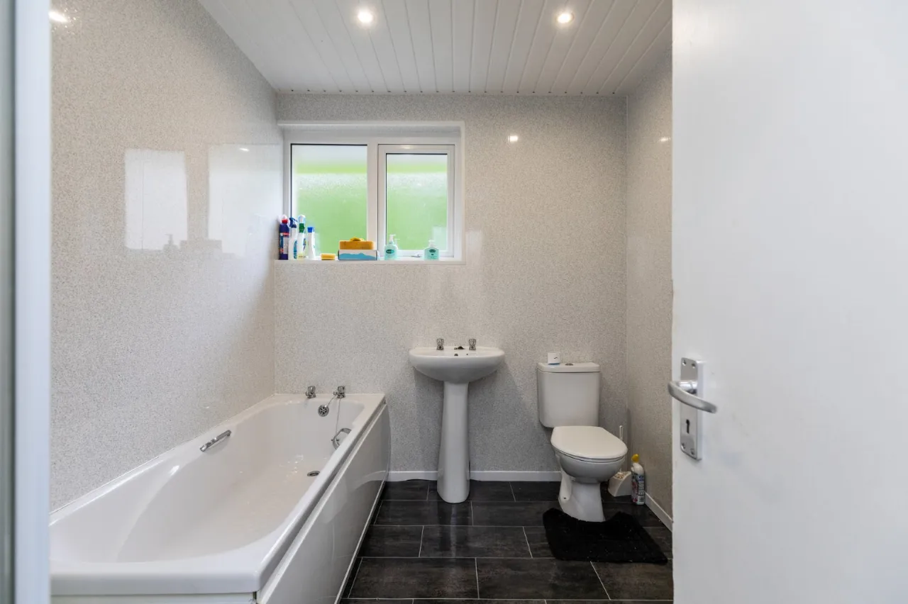 White suite comprising: Panelled bath, shower cubicle with thermostatic shower, pedestal wash hand basin, low flush WC.