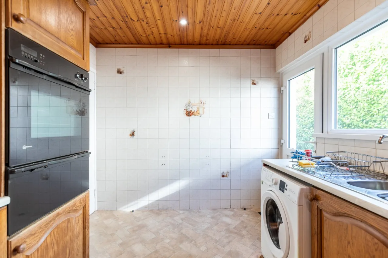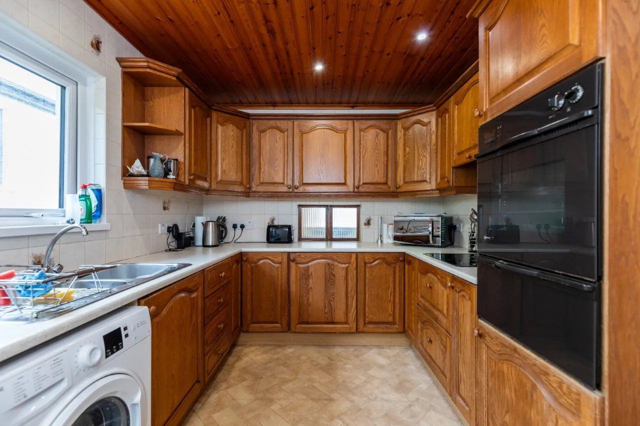 Fitted with a range of high and low level units, stainless steel single drainer 1.5 bowl sink unit with mixer taps, plumbed for washing machine, 4 ring ceramic hob, eye level oven.