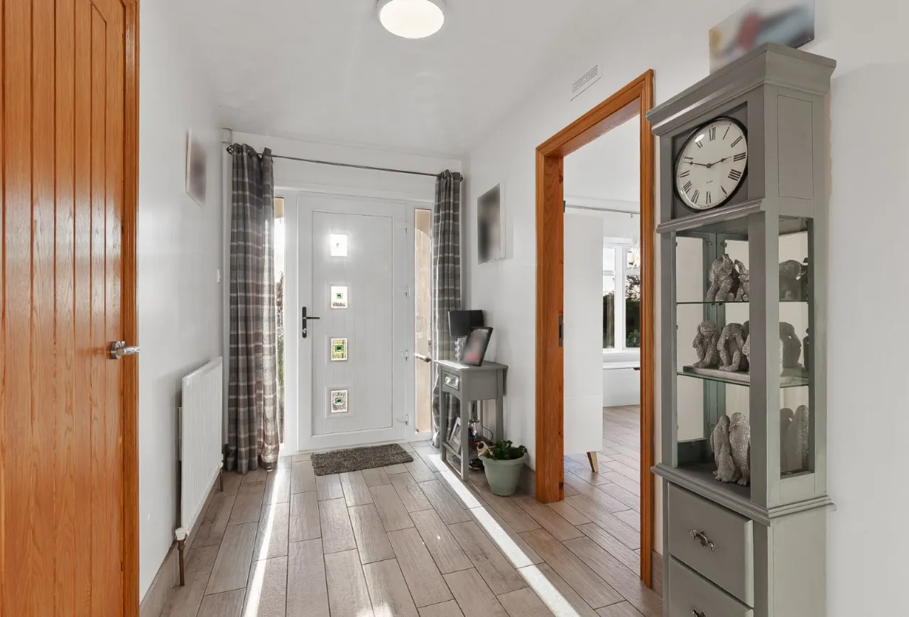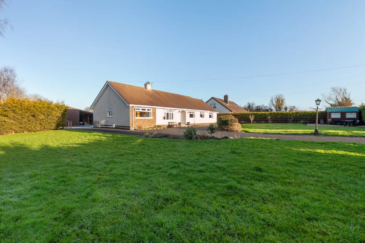 Tarmac driveway leading to excellent parking and turning areas with additional hardstanding to the rear. Generous, level, front, side and rear gardens in lawns. Large agricultural shed ideal for a multitude of uses and adjoining car port.