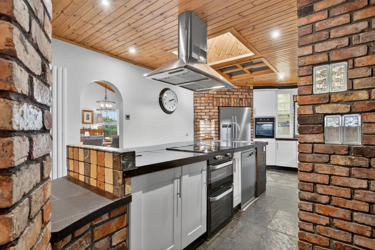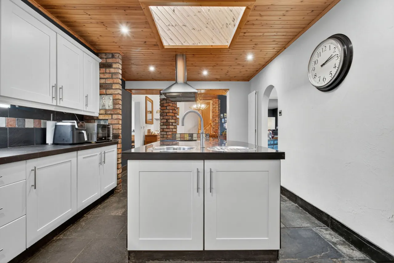 Full range of high and low level units and glazed display cabinet, recess for large fridge freezer, plumbed for dishwasher, central island with polished porcelain work surface, stainless steel single drainer sink unit with Quooker tap, slate floor.