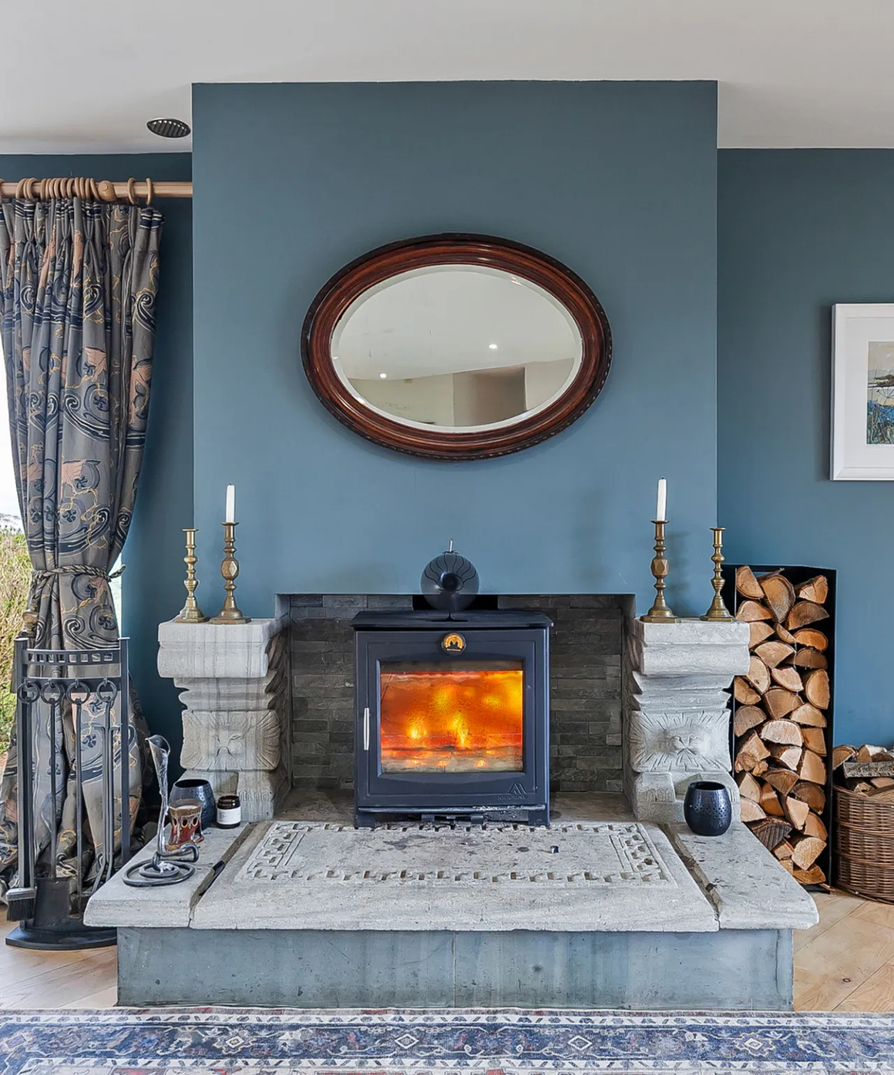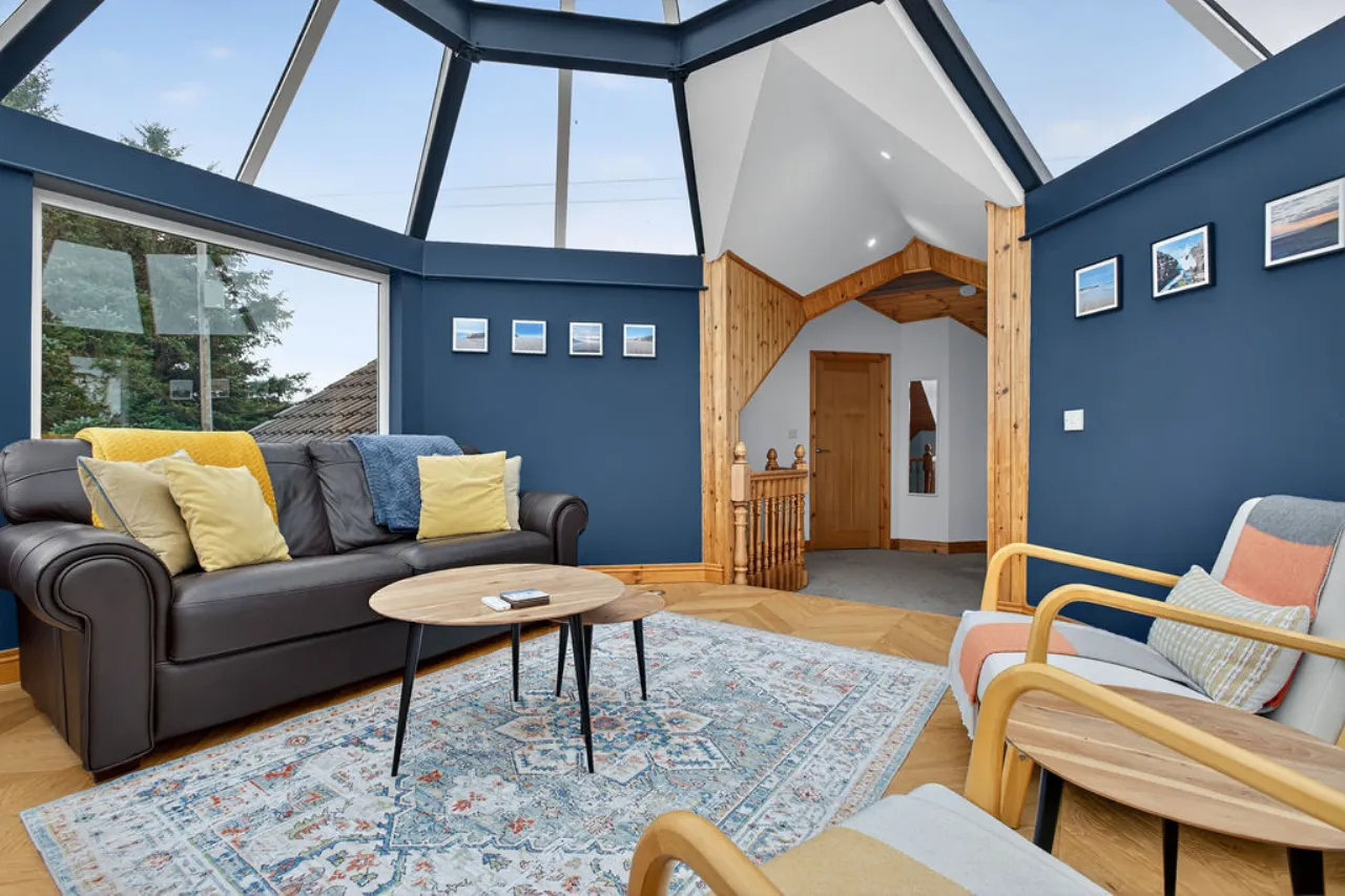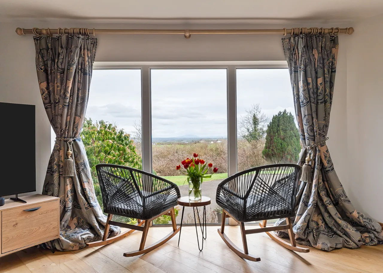 Mourne 12.5 KW multi fuel stove on raised stone plinth, ash wood floor, dual aspect with views over surrounding countryside to Ballycastle, Portstewart and Portrush. Open to: