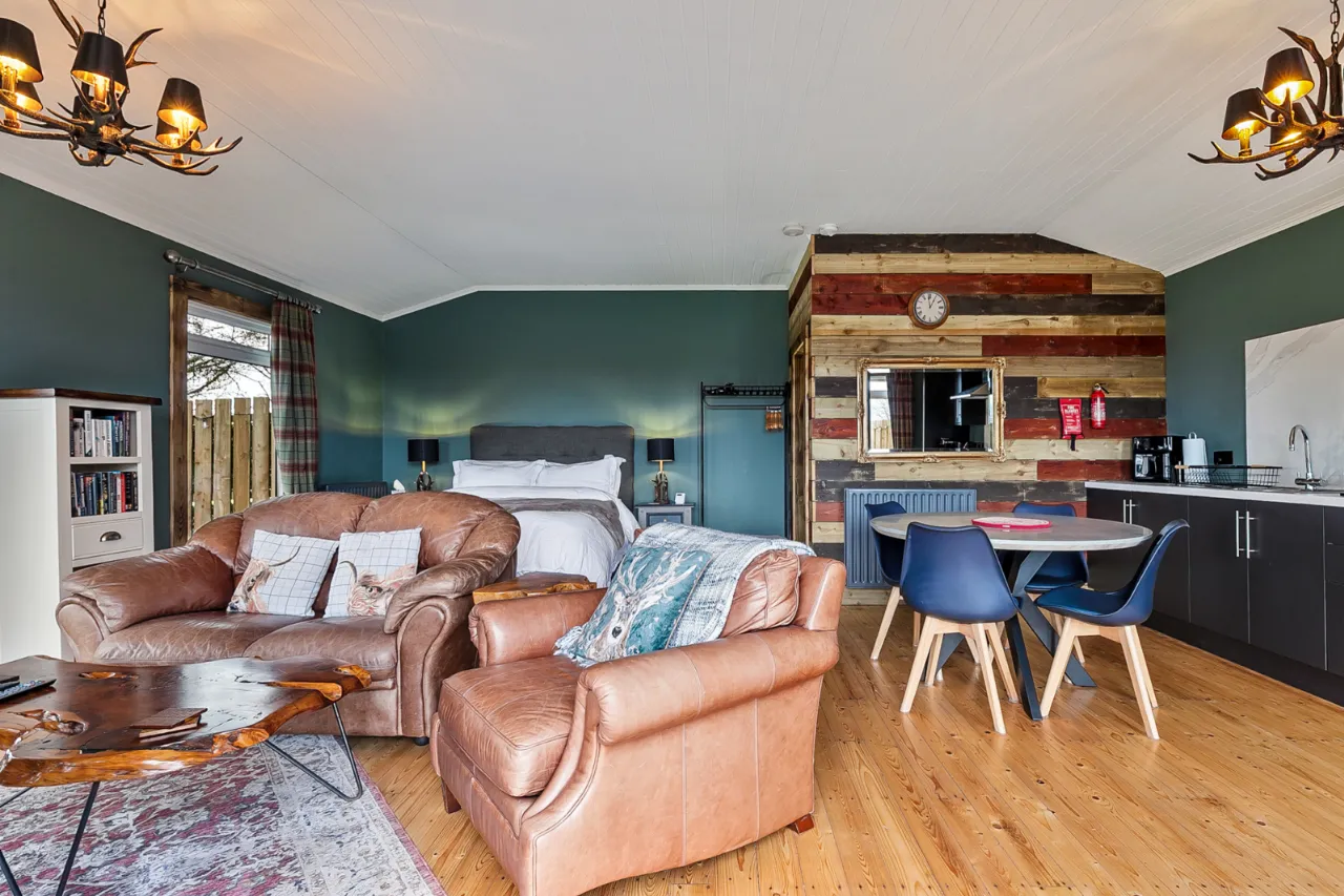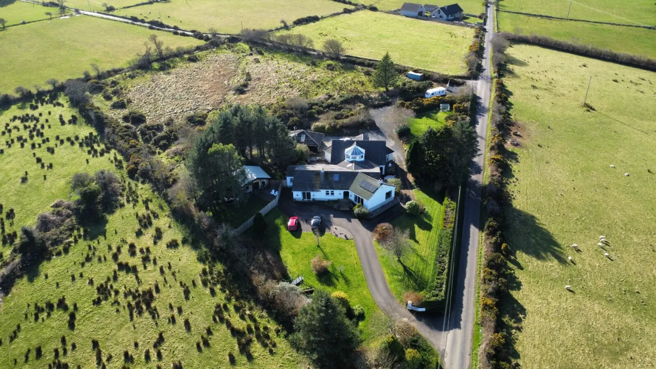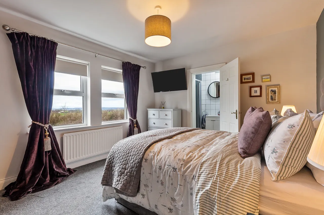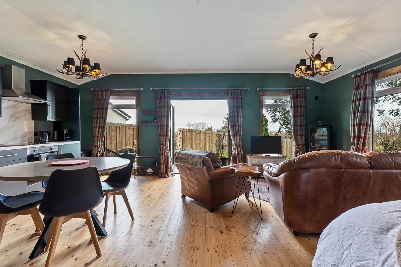 Mourne 12.5 KW multi fuel stove on raised stone plinth, ash wood floor, dual aspect with views over surrounding countryside to Ballycastle, Portstewart and Portrush. Open to: