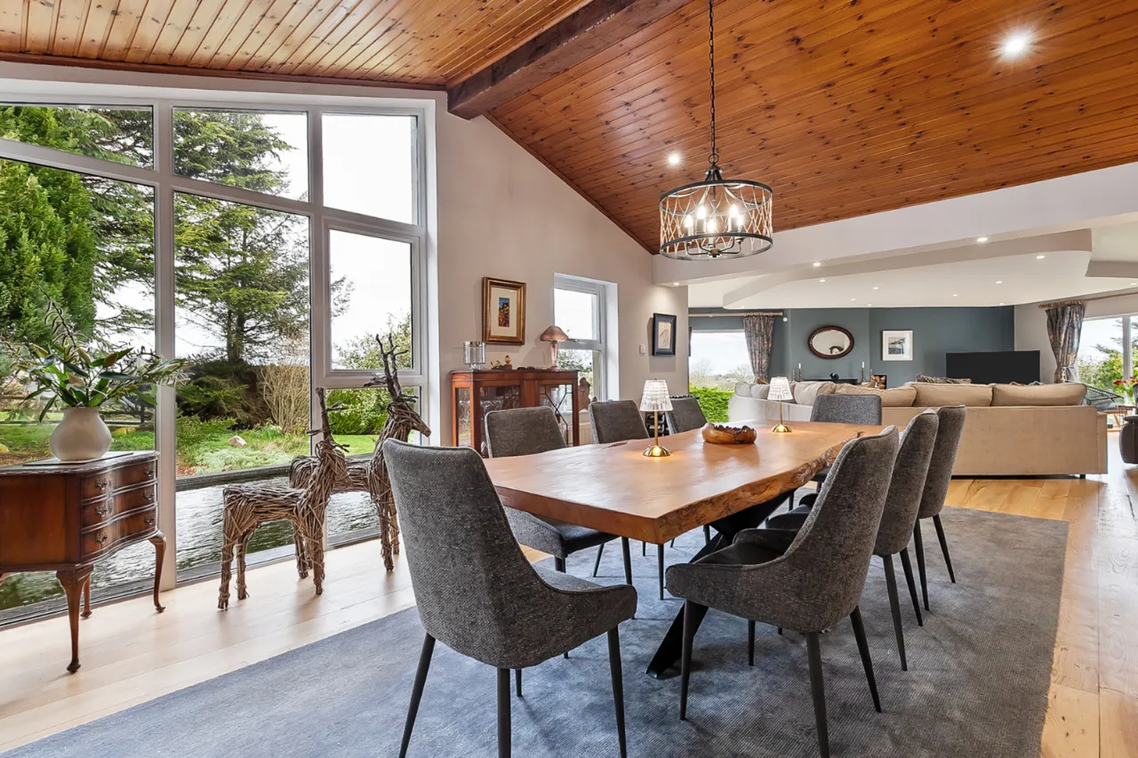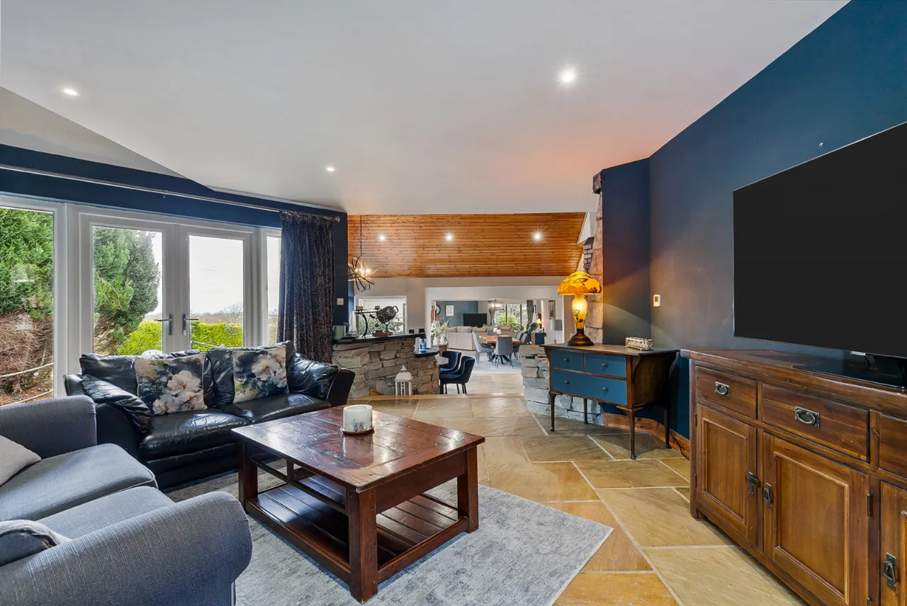 Slate floor, French double doors leading to decking overlooking pond.
