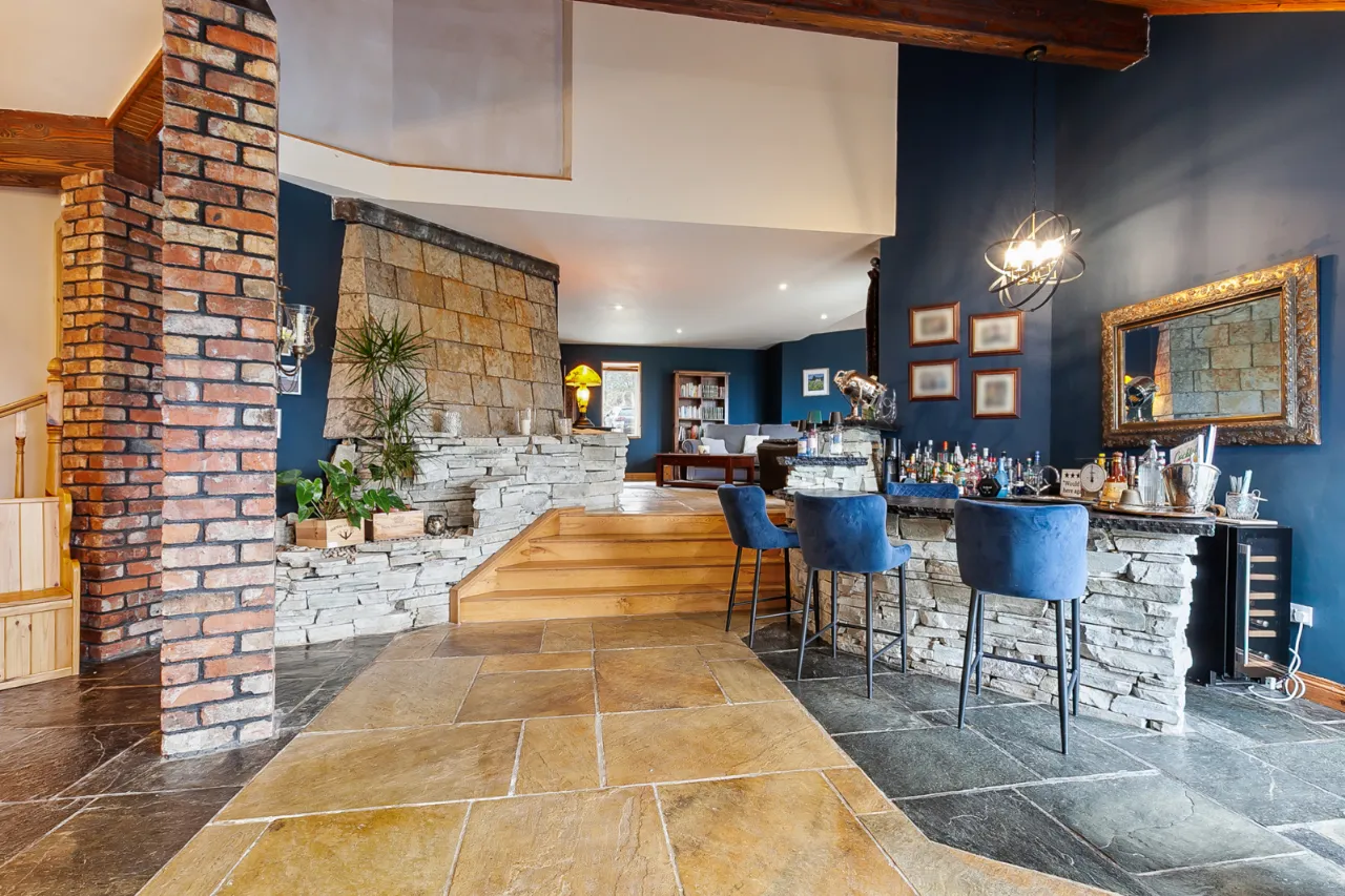 Slate floor, stone built bar overlooking fish pond. open to steps up to: