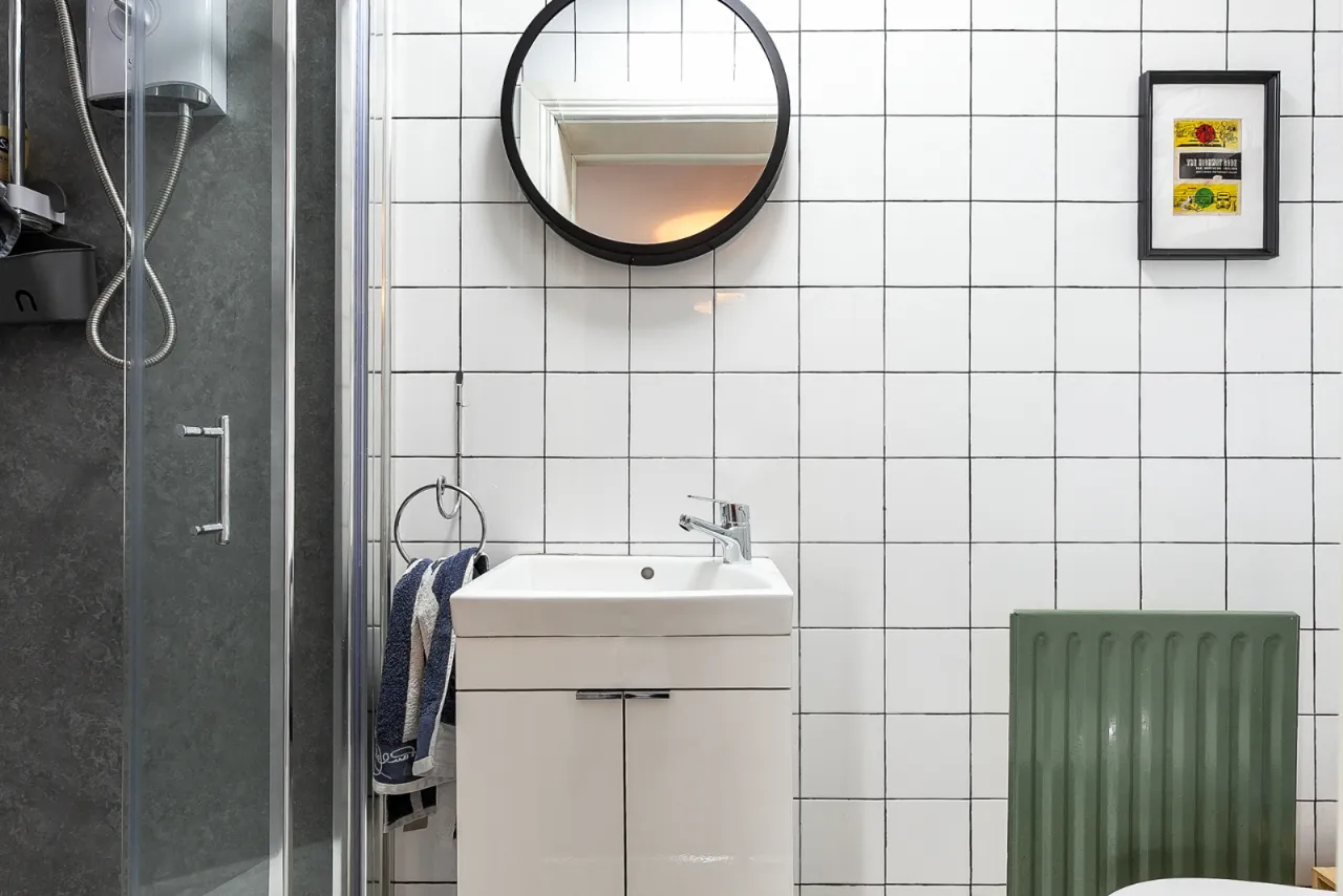 Fully tiled shower cubicle with instant heat electric shower, vanity sink unit with mixer taps, low flush WC, ceramic tiled floor.