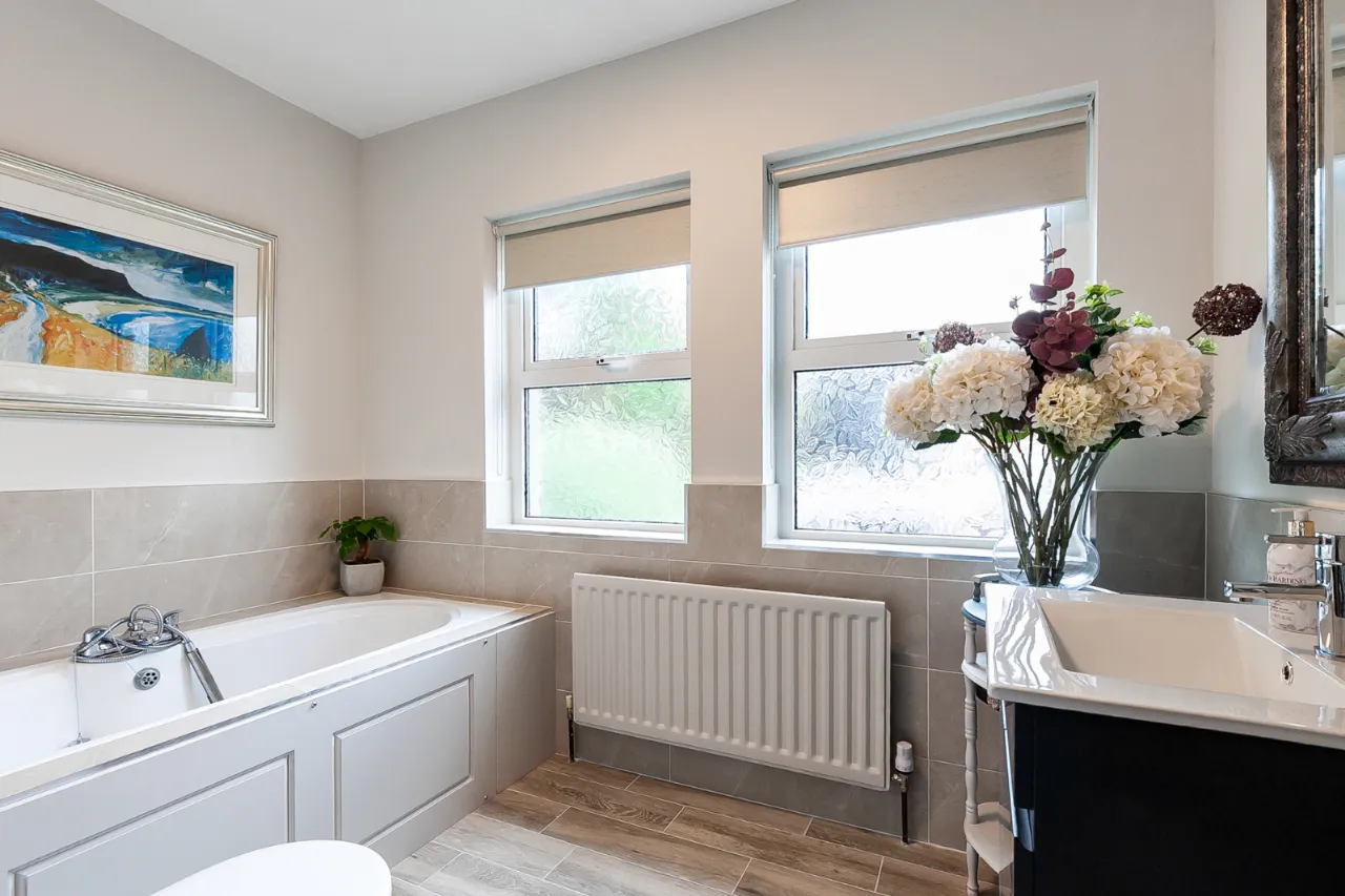 White suite comprising: Panelled bath with mixer taps and telephone hand shower fitting, low flush WC, vanity sink unit, partly tiled walls, ceramic tiled floor.