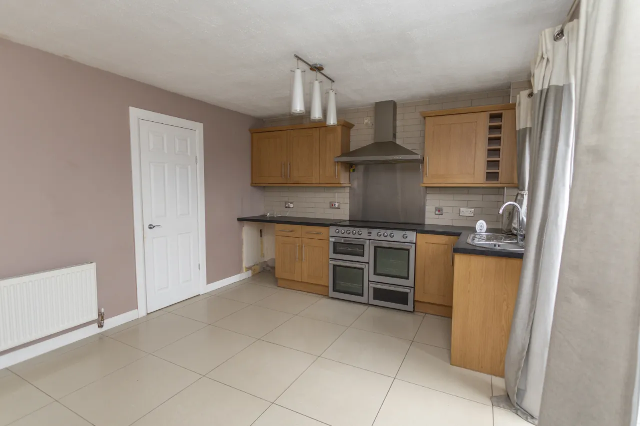 Kitchen and dining area with tiled flooring, a range of upper and lower wooden units with laminate work surfaces and tiled splashback. Includes a Flavel range-style electric cooker, with space for a washing machine and fridge freezer. Features a round stainless steel sink and drainer and double doors opening to the south-west facing rear garden, ideal for entertaining and family living.