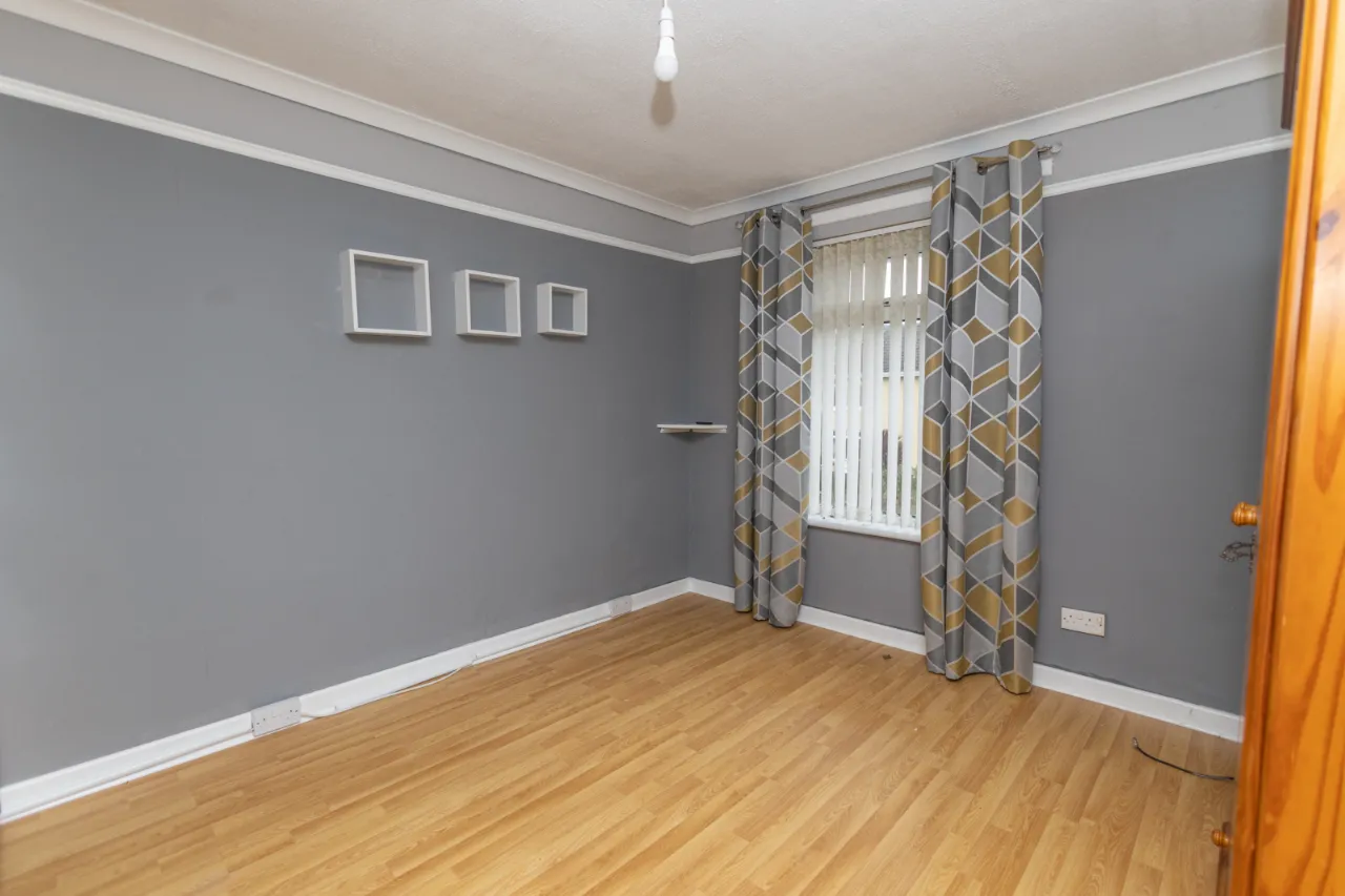 Well-proportioned room with laminate flooring, built-in storage, double panel radiator, and front aspect window, offering a bright and comfortable space.