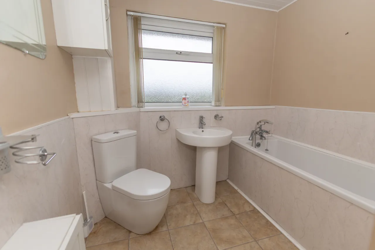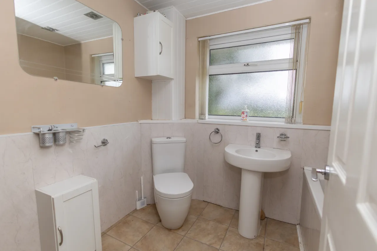 Fitted with tiled flooring and half-tiled walls, featuring a white suite comprising WC, wash hand basin, bath and electric shower. Heated towel rail.