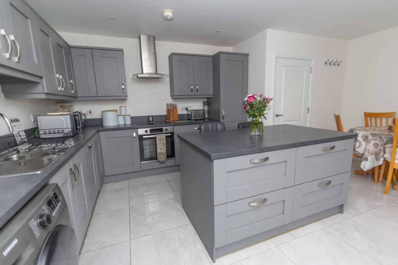 Tiled flooring with a range of upper and lower units complemented by laminate work surfaces. Integrated appliances include a Beko dishwasher and electric hob with oven and extractor hood above. Space is provided for a fridge freezer and washing machine. Feature island unit with breakfast bar and generous drawer storage, along with a TV point.