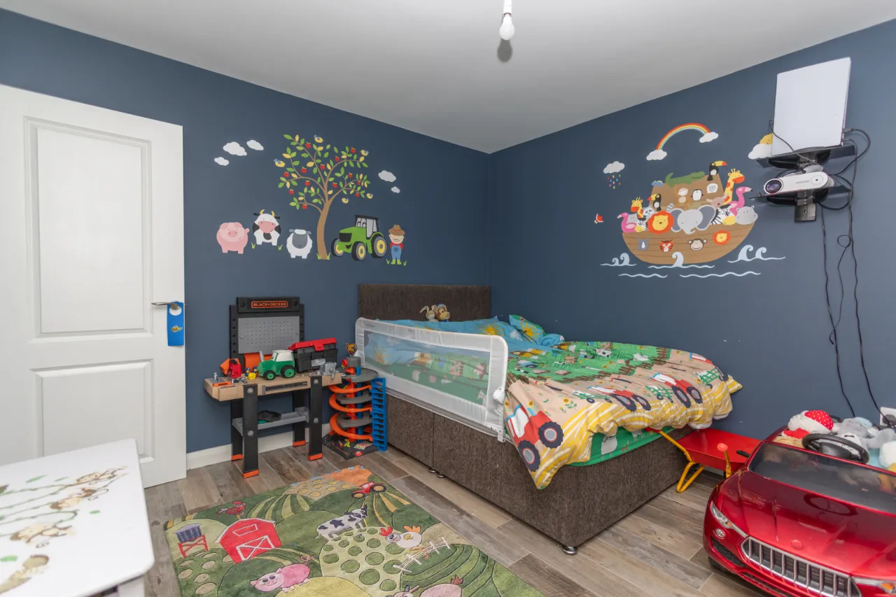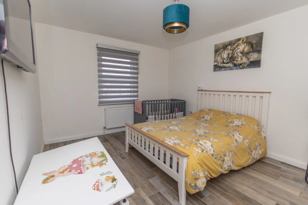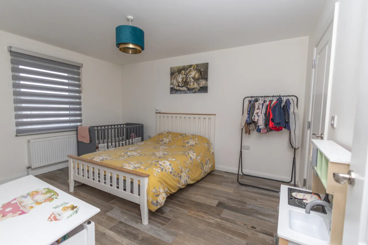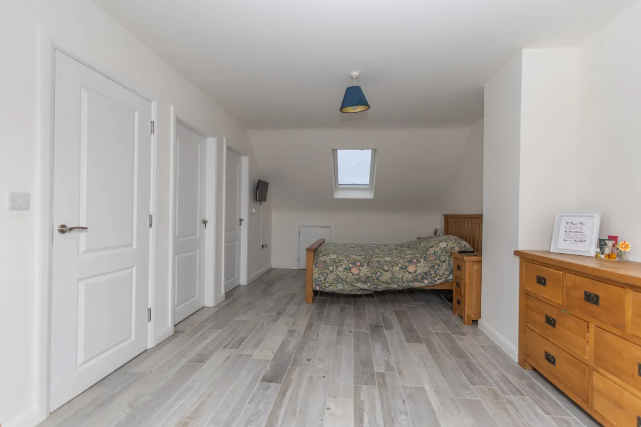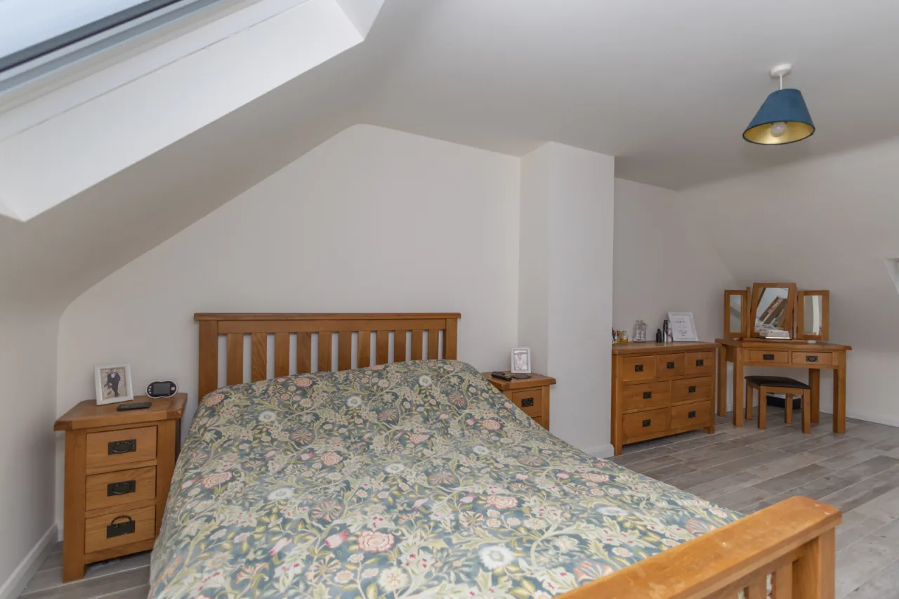 Wood-effect tiled flooring, double radiator and TV point. Storage under the eaves. Walk in wardrobe with hanging space and carpet flooring.